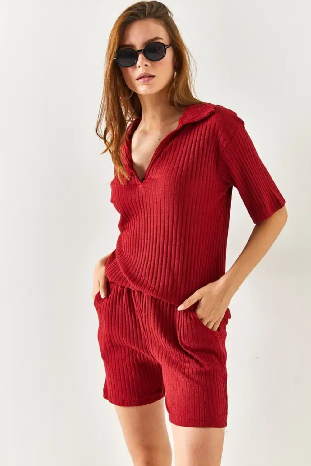 2-Piece Set Dusty Rose Polo Collar Top with Ribbed Pocket Shorts