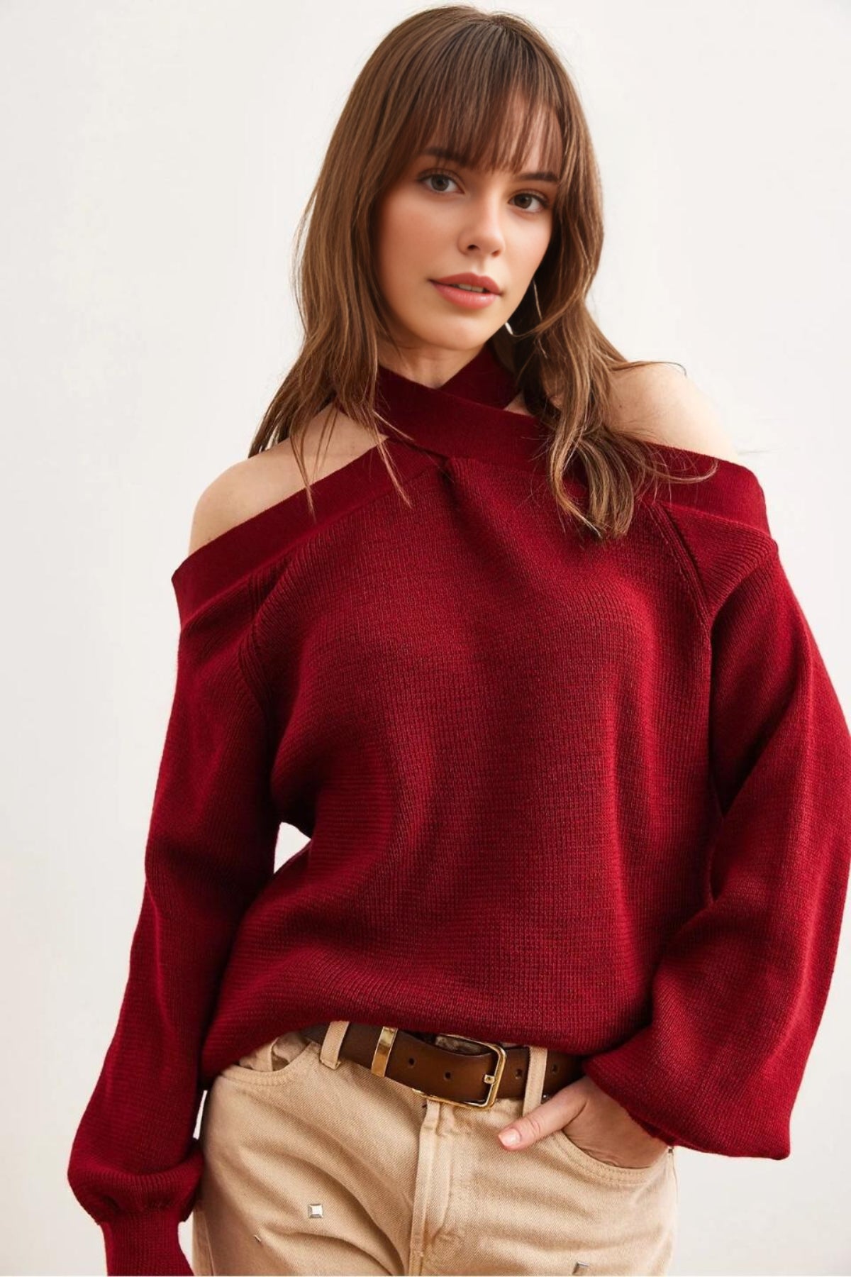 Cross-Neck Knit Sweater