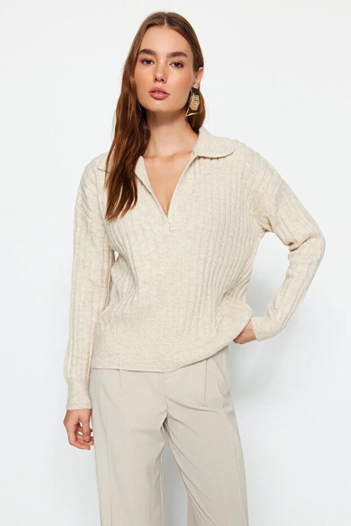 Soft-Textured Viscose Polo Neck Knit Sweater