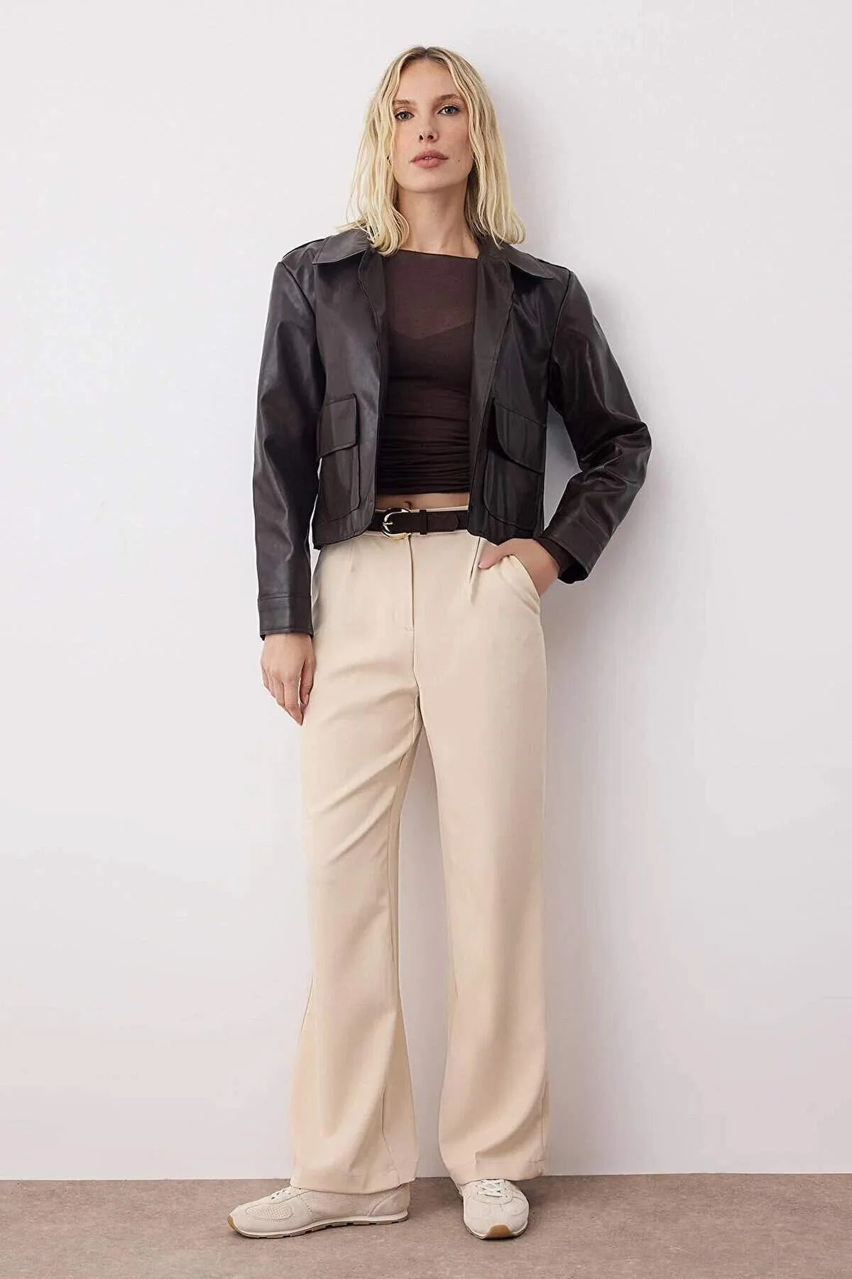 High Waist Wide Leg Pleated Woven Fabric Trousers