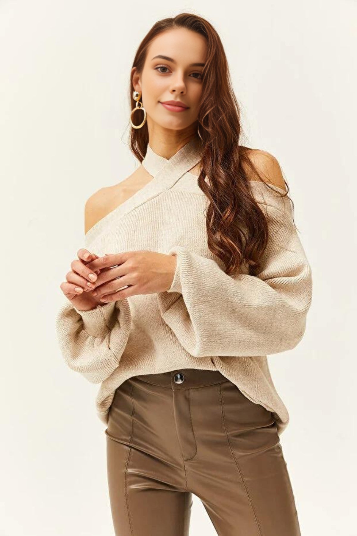 Draped Detail Flowing Asymmetric Neck Knit Blouse