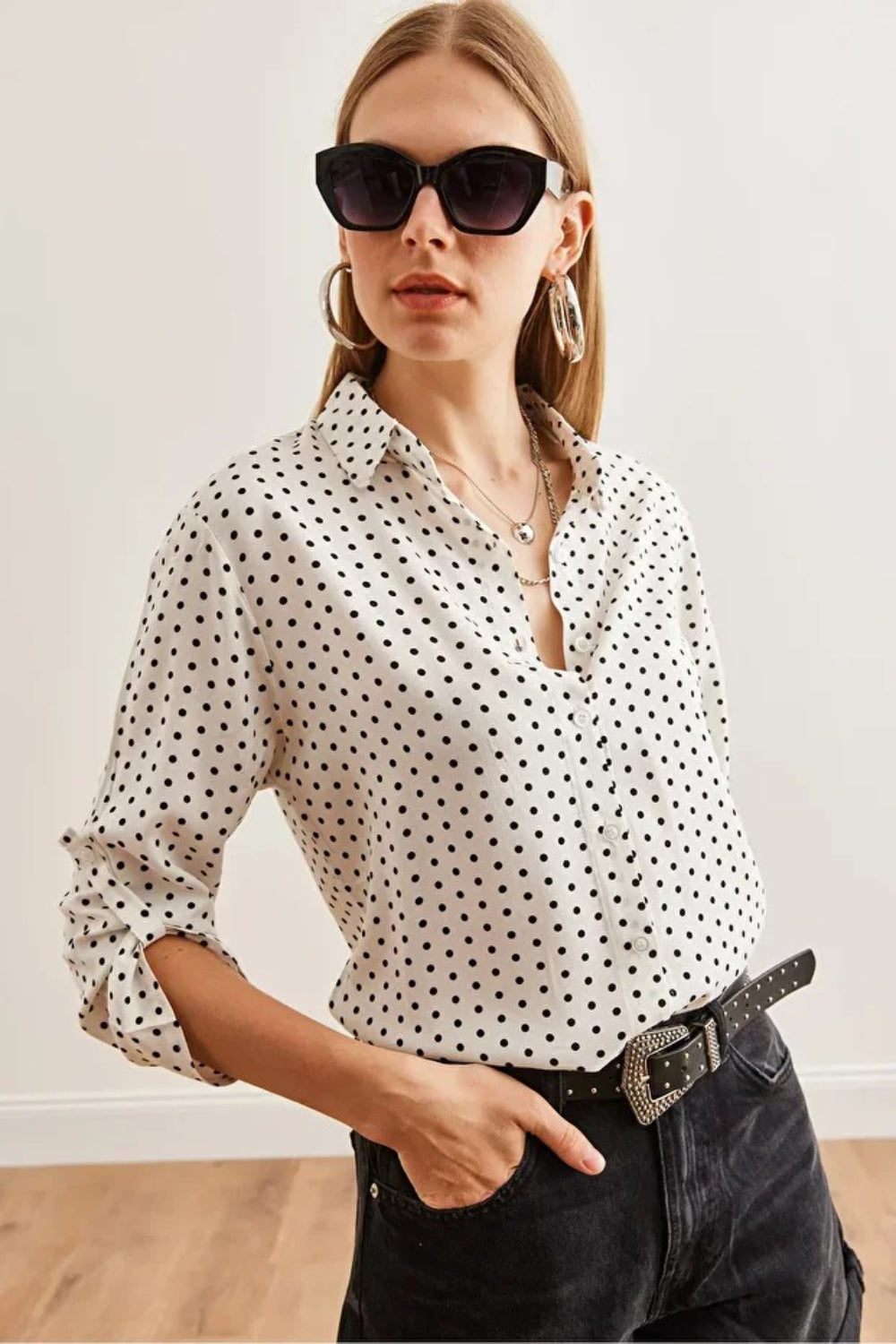Oversized Long-Sleeves Pointed Collar Neckline Blouse in Beige