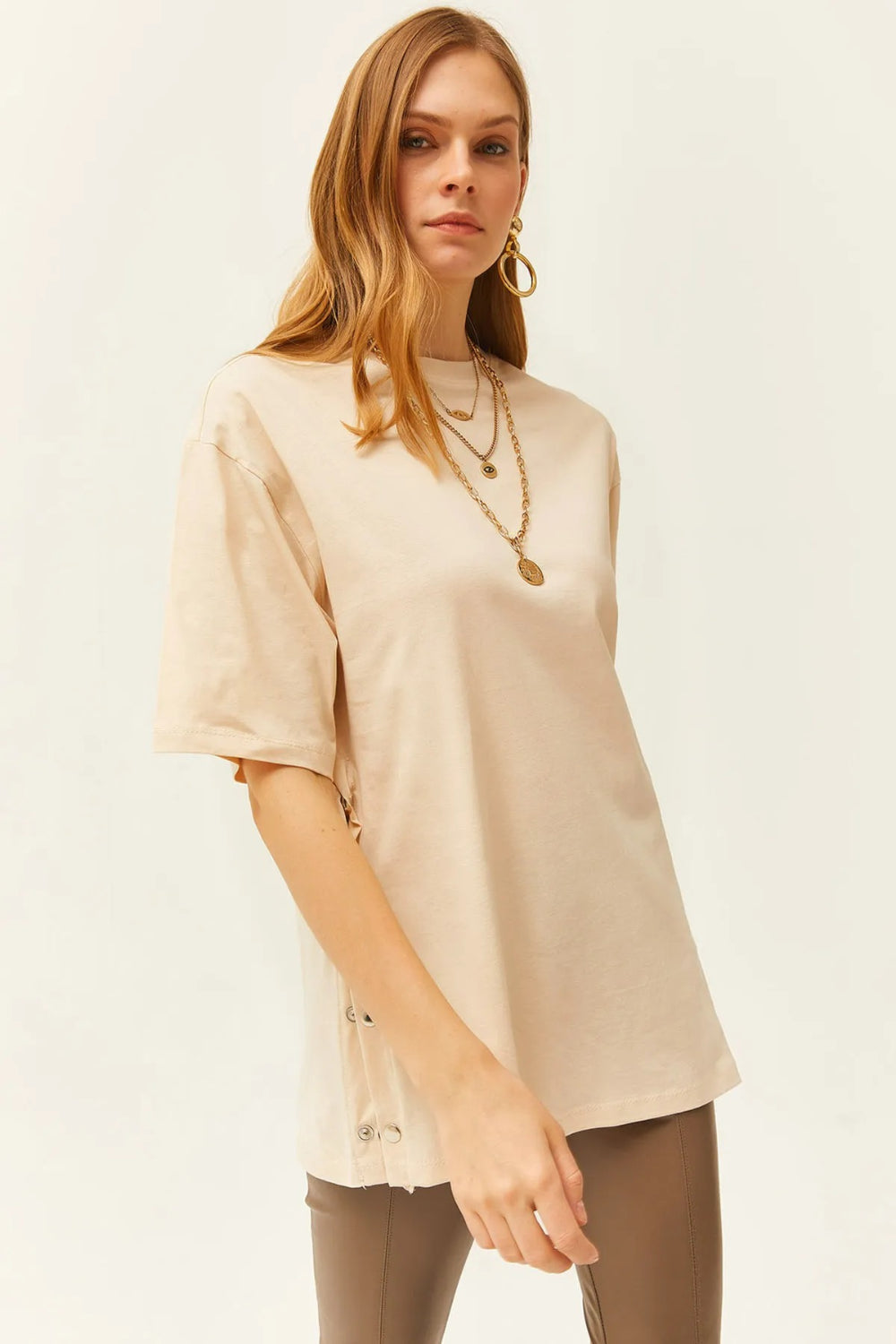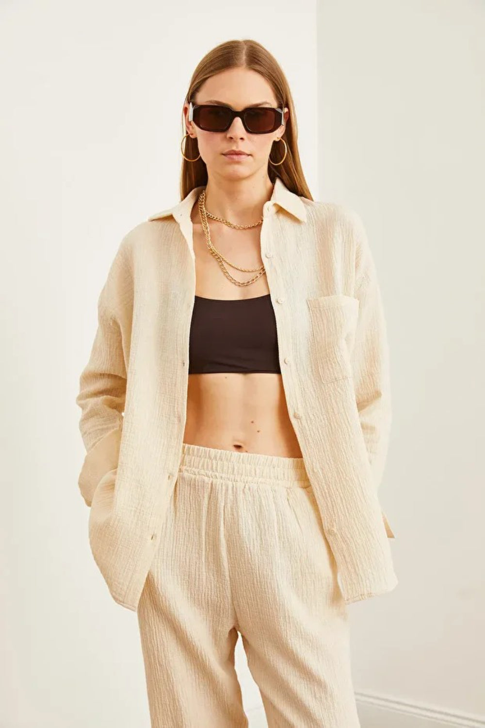 Oversized Tie Detailed Shirt Tunic with Long Sleeves in Beige