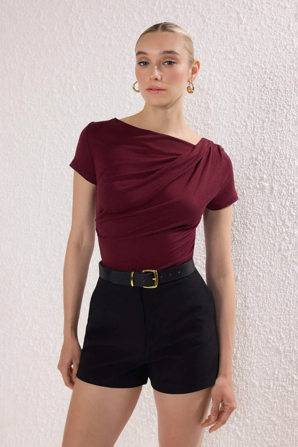 Boat Neck Draped Fitted Stretch Knit Blouse