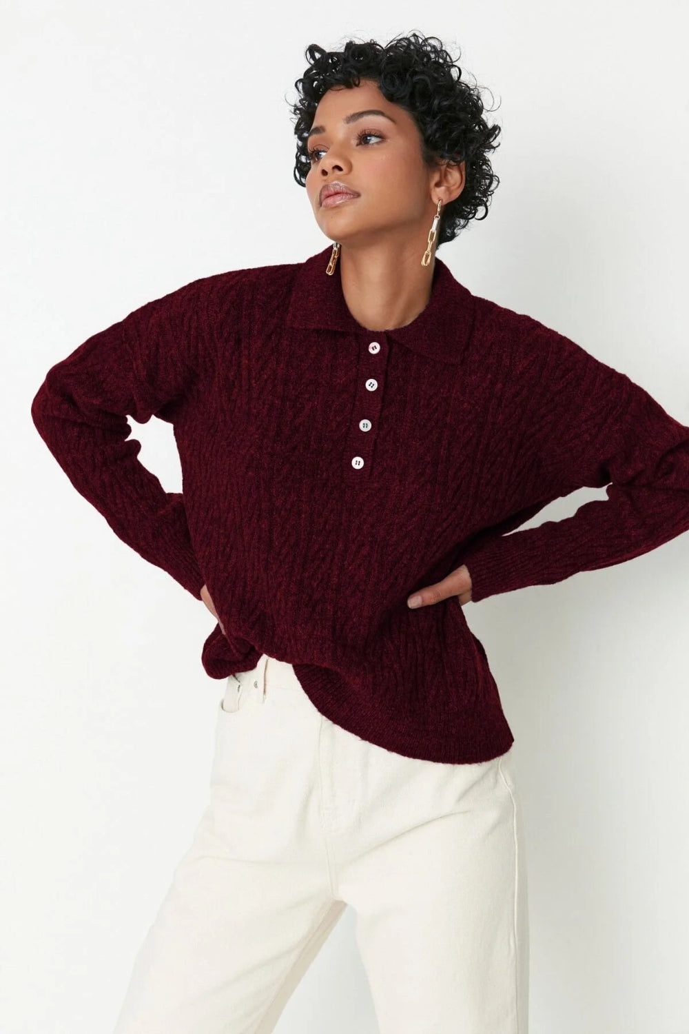 Soft-Textured Polo Neck Knit Sweater