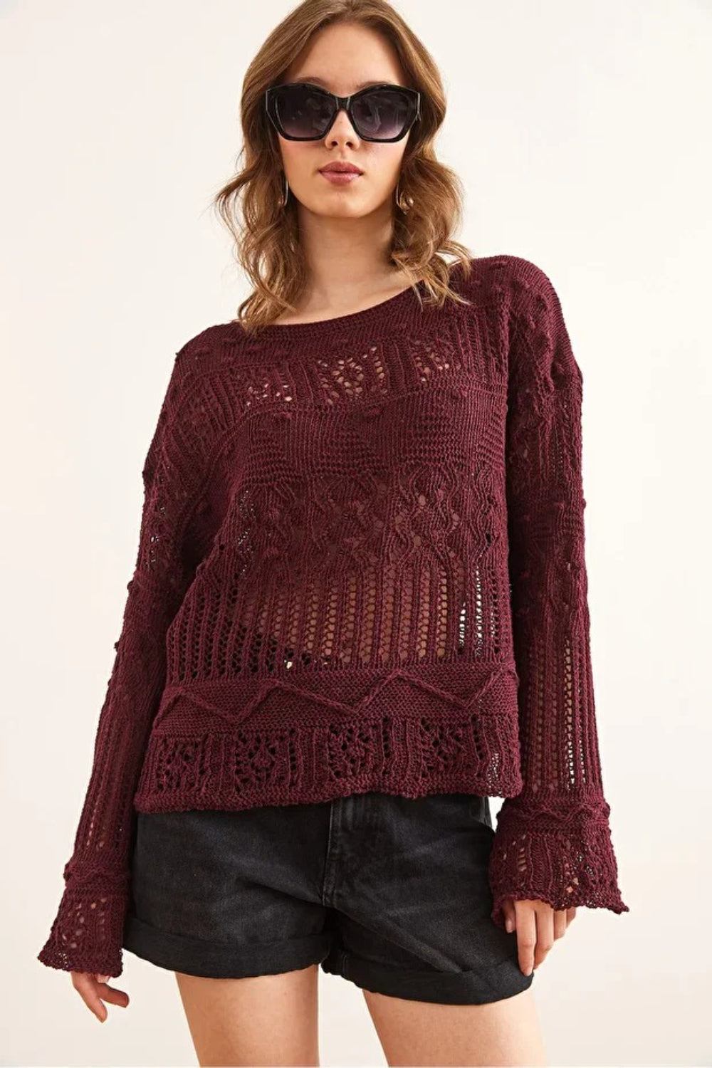 Oversized Long Sleeves Frill Front Blouse with Detailed Neckline in Burgundy
