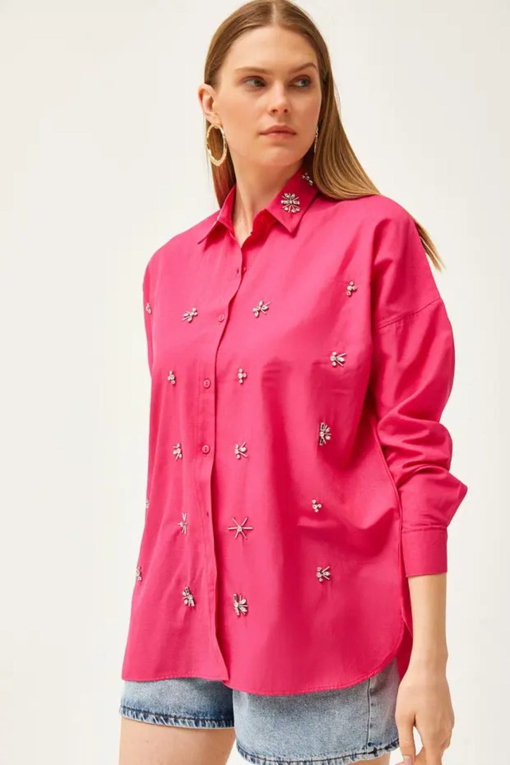 Taupe Shirt with Stone-Embellished Collar and Front, Oval Hem