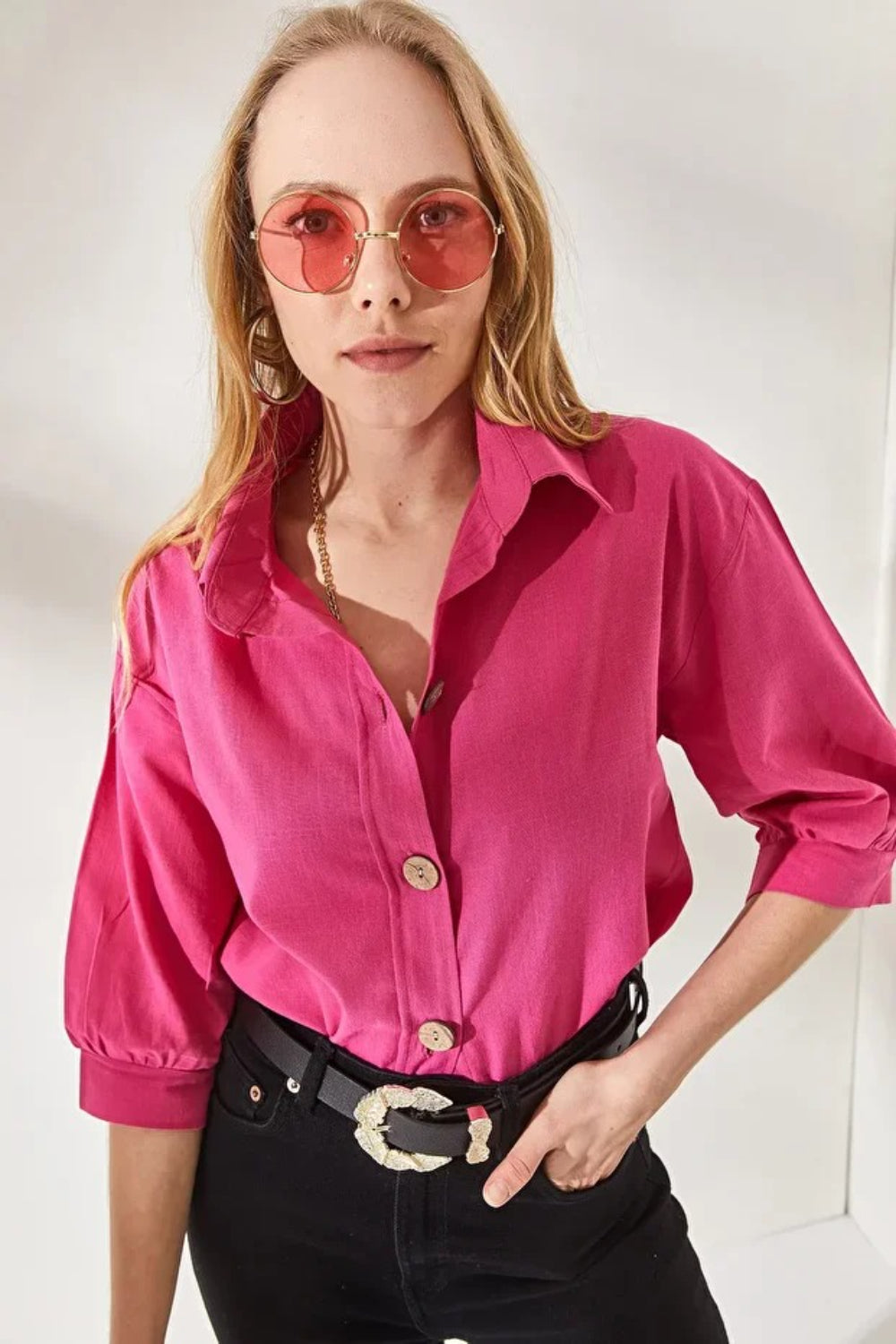 Linen Shirt with Wooden Buttons and Three-Quarter Sleeves