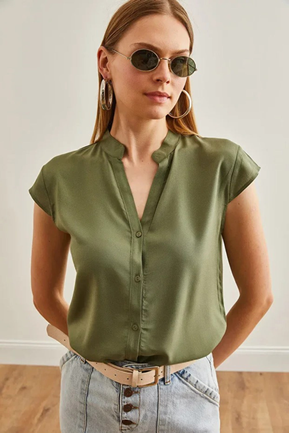 Polo Collar Color-Detail Stretch Cotton Blouse