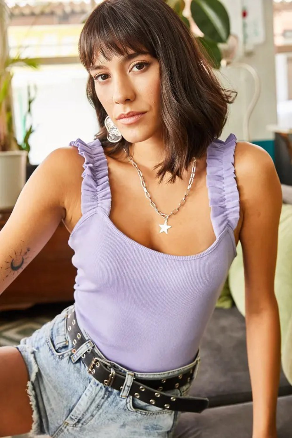 Ruffled Strap Stretch Ribbed Blouse