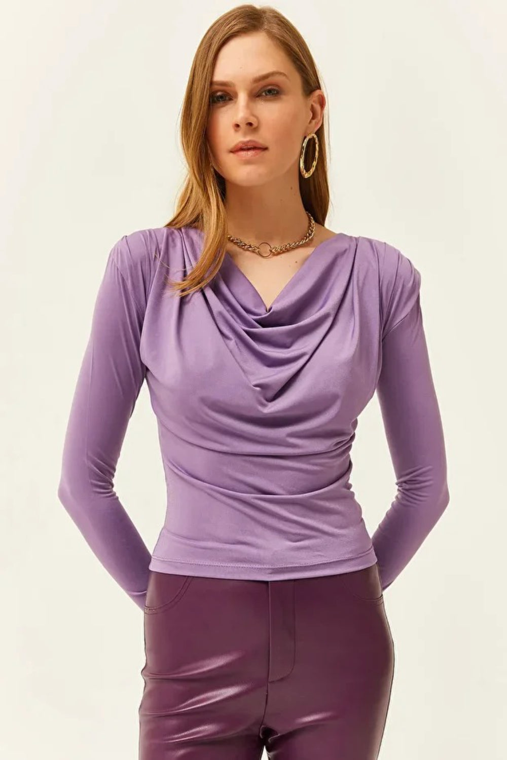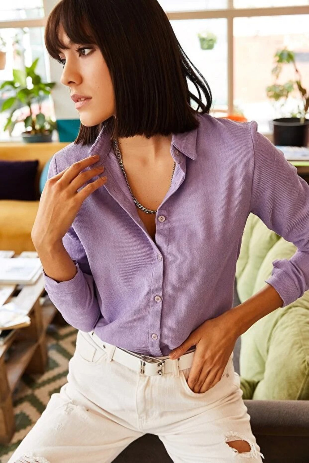 Oversized Long-Sleeves Pointed Collar Neckline Blouse in Lilac