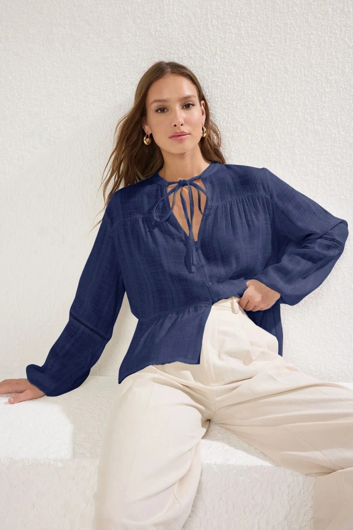 Relaxed Fit Long Sleeve Elegant Blouse with Ruffle Neckline