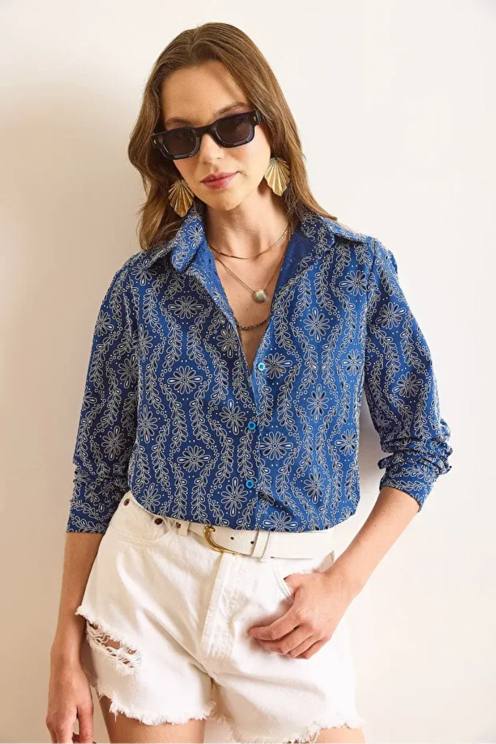 Cotton-Textured Regular Fit Woven Shirt with Lace Sleeve Detail