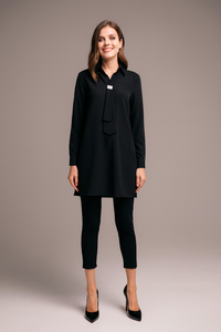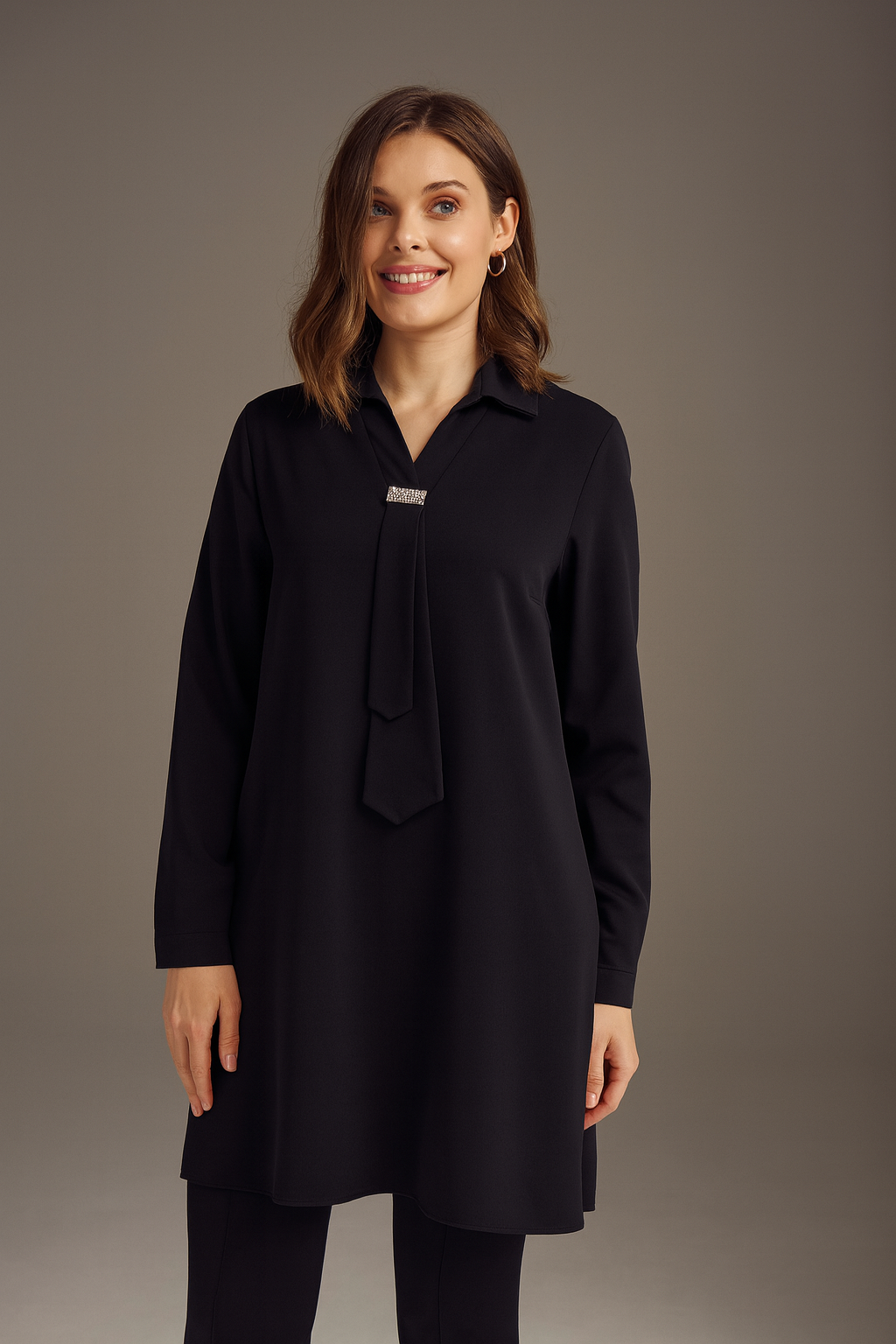 Oversized Long Sleeves Shirt Collar Tunic Top with Brooch Detail in Black