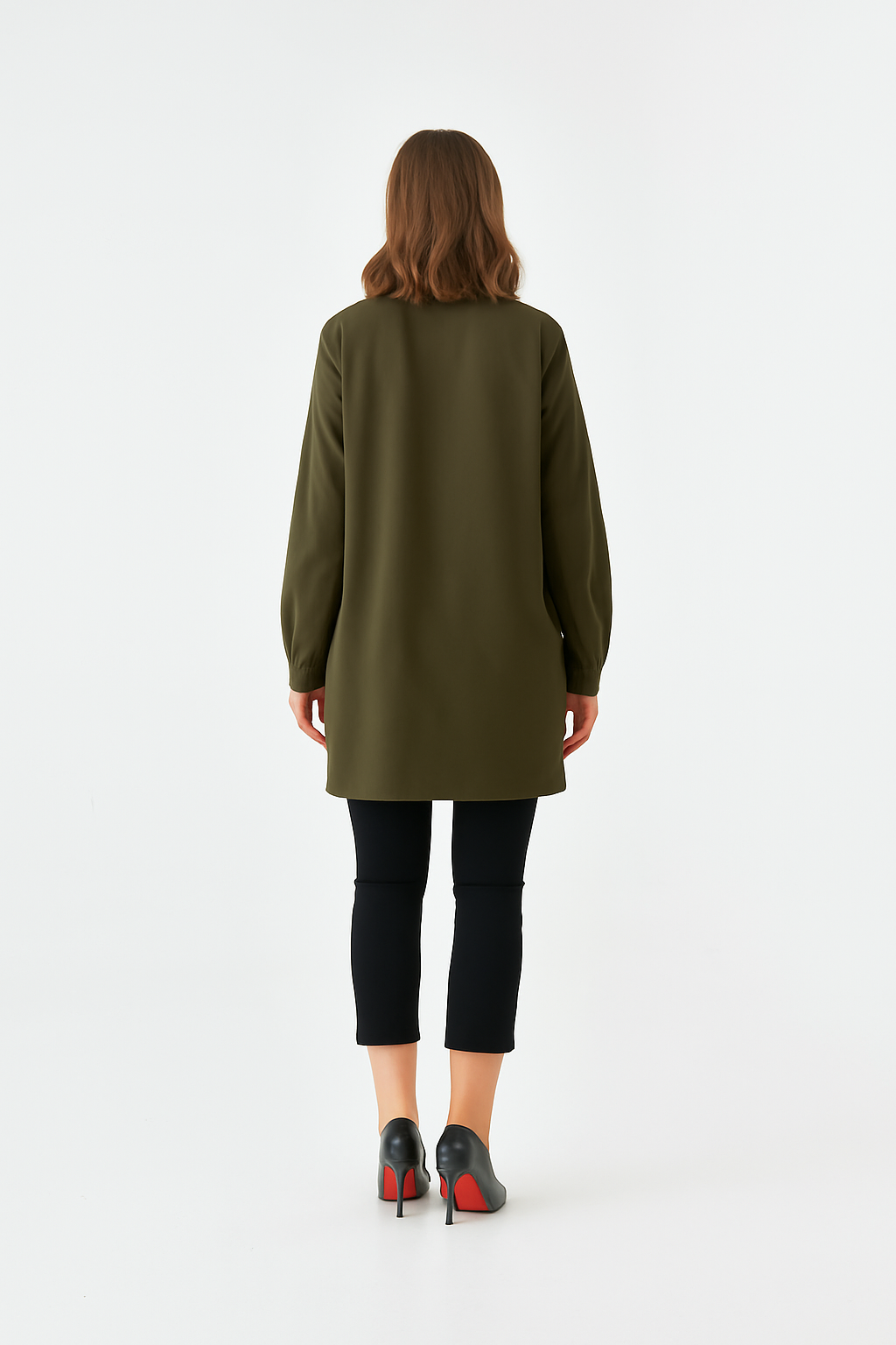 Oversized Long Sleeves Shirt Collar Tunic Top with Brooch Detail in Khaki