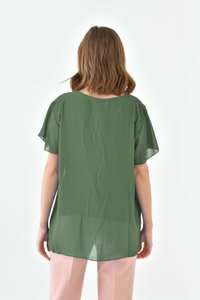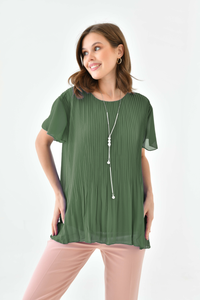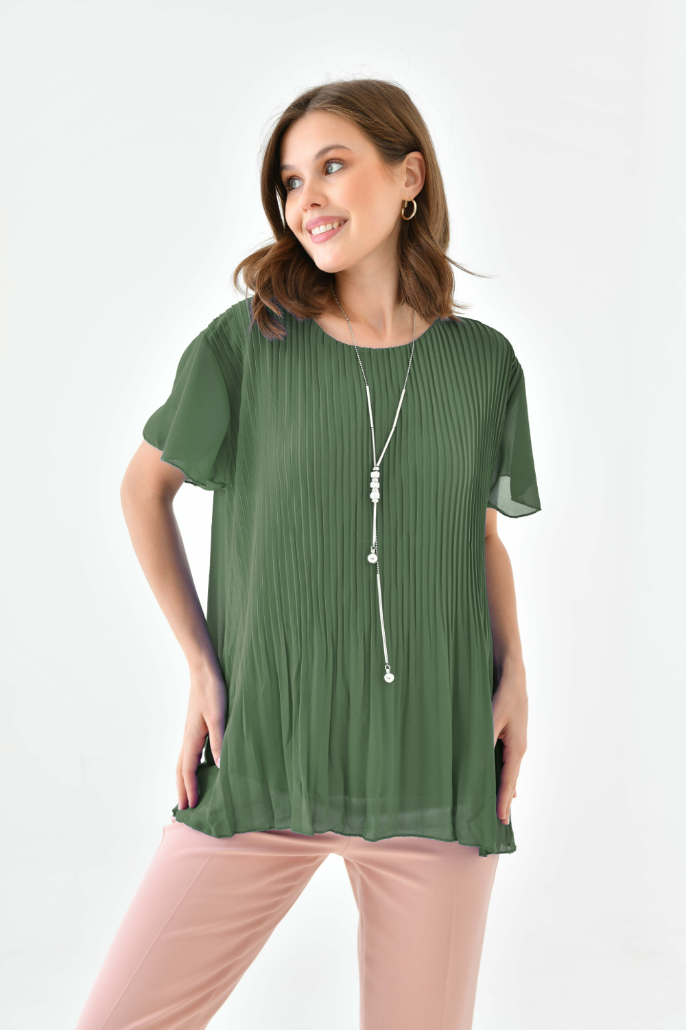 Oversized Round Neck Short Sleeve Pleated Blouse in Khaki with Necklace