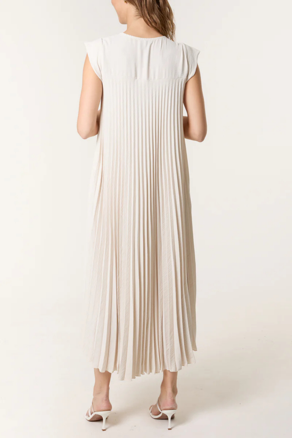 Oversized Cap Sleeve Pleated Maxi Dress in Beige