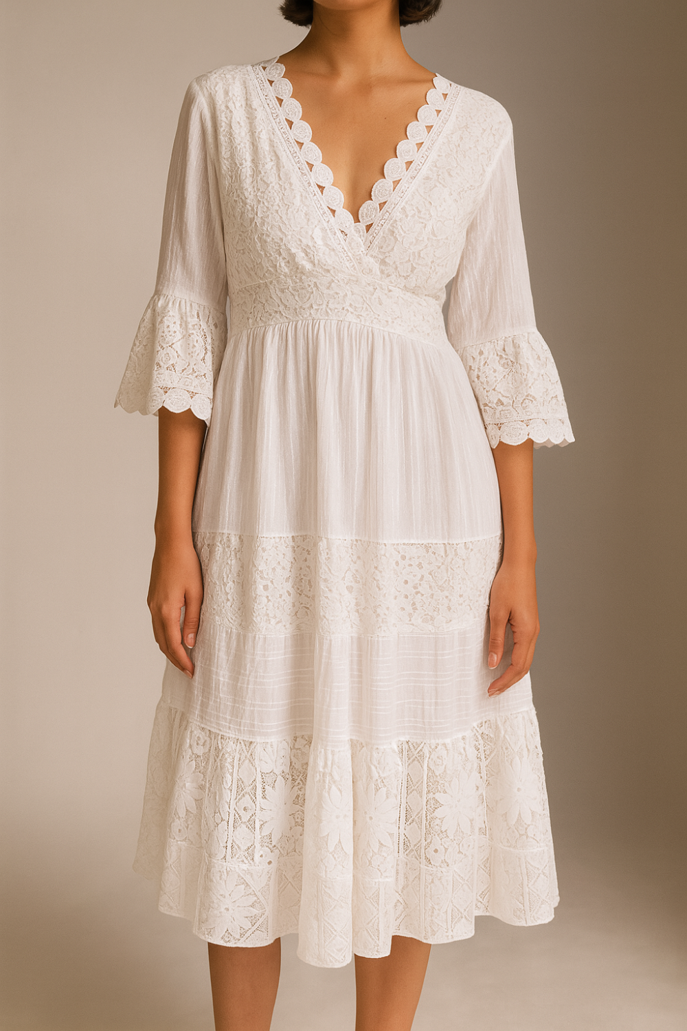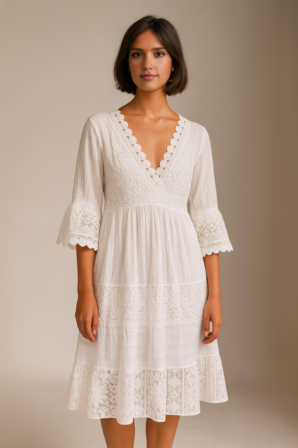 Relaxed Fit Lace Detail Midi Dress with 3/4 Sleeves and V-Neckline in White