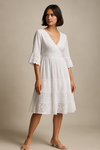 Embrace timeless elegance with our Relaxed Fit White Lace Detail Midi Dress with 3/4 Sleeves and V-Neckline. Crafted from soft, breathable fabric, this dress offers a graceful silhouette with intricate lace panels and scalloped trims. The relaxed fit ensures day-long comfort, while the flattering V-neck and tiered design add romantic charm. Ideal for garden parties, brunches, or seaside strolls—this versatile piece combines comfort with refined style.