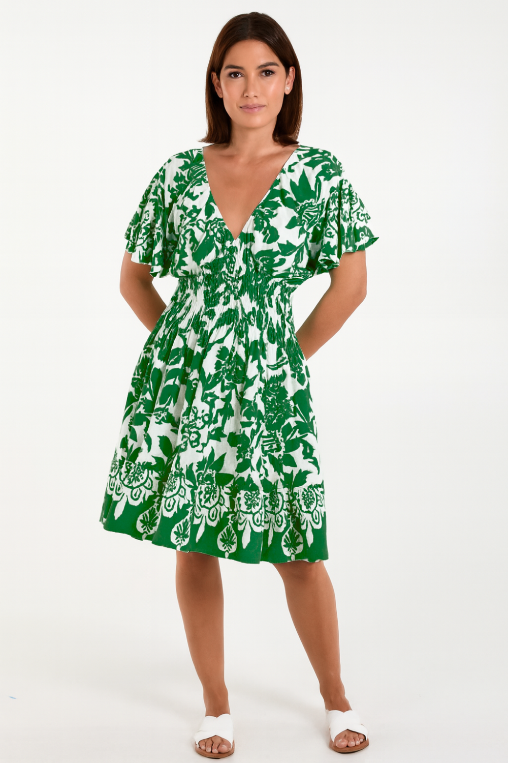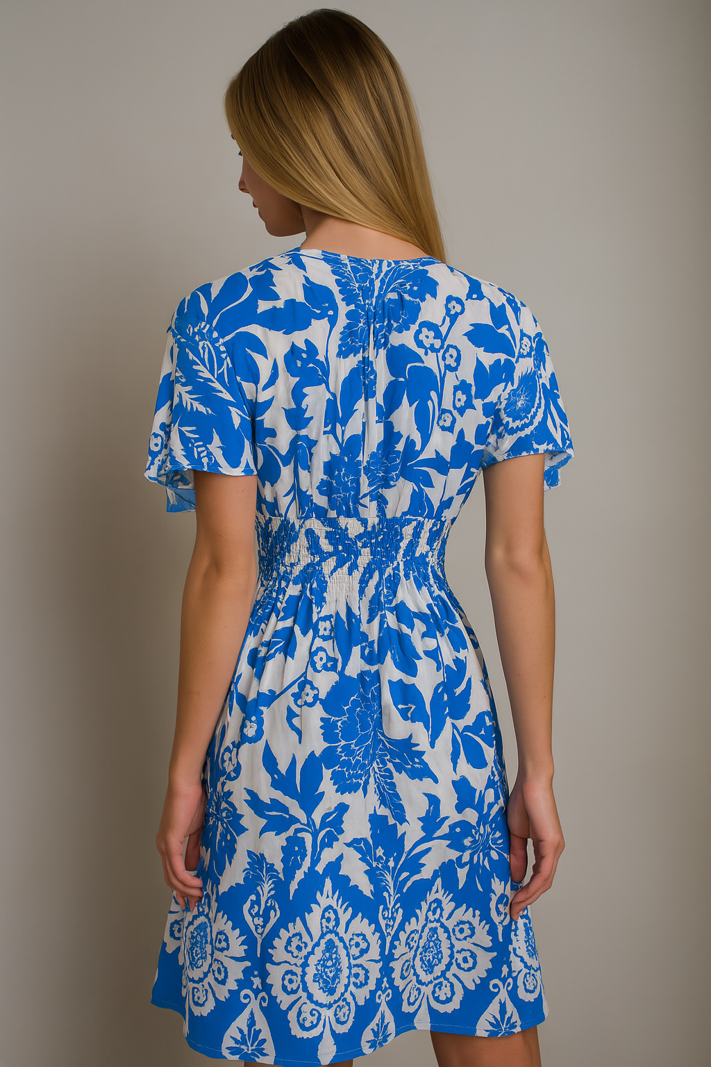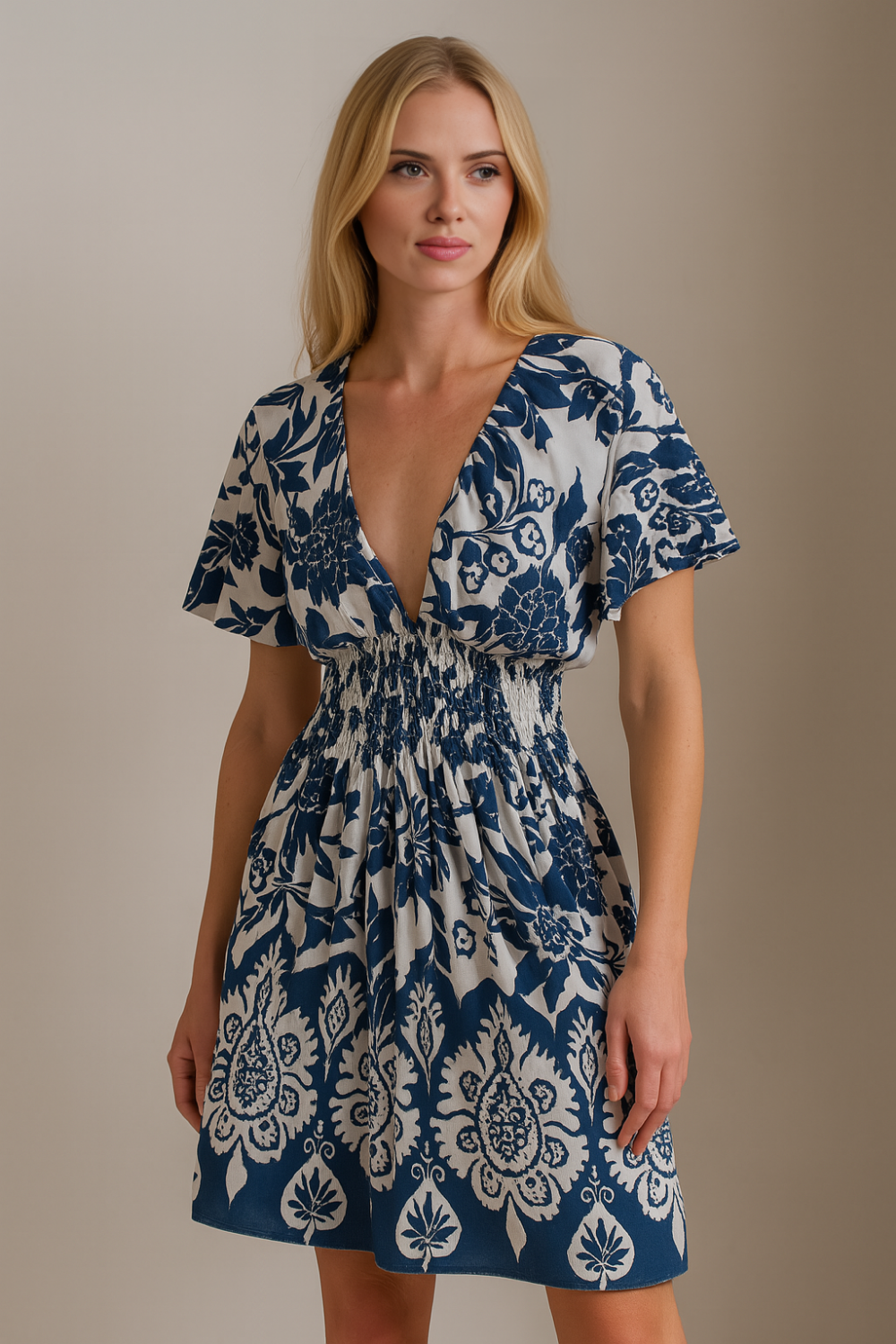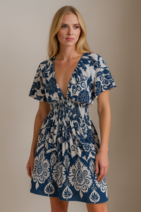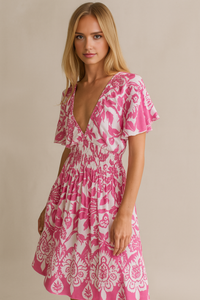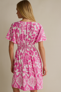 Designed with a relaxed oversized silhouette and a smocked waist to enhance your natural shape, this mini dress is a celebration of carefree style. The soft colours hue and white floral print adds a romantic charm, while the deep V-neckline and short flutter sleeves offer a flattering, feminine touch.