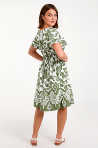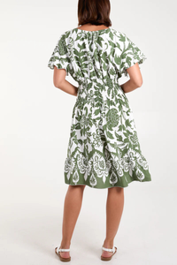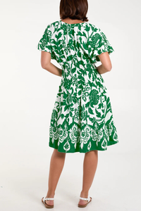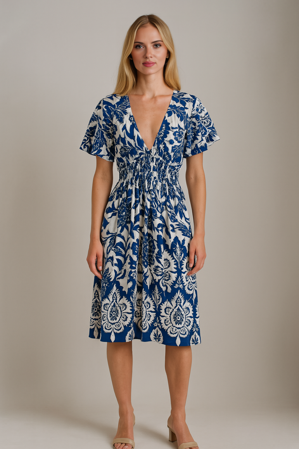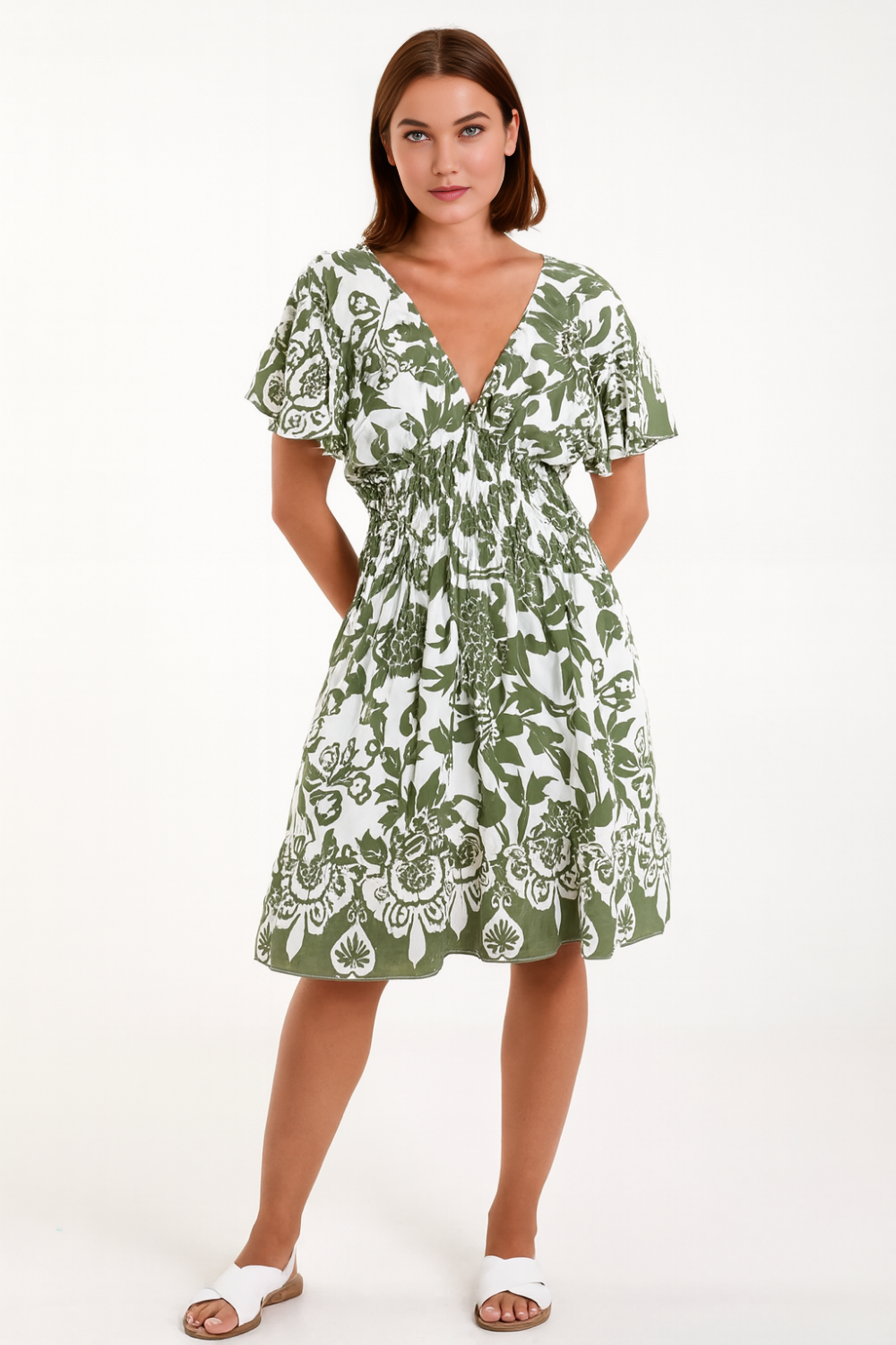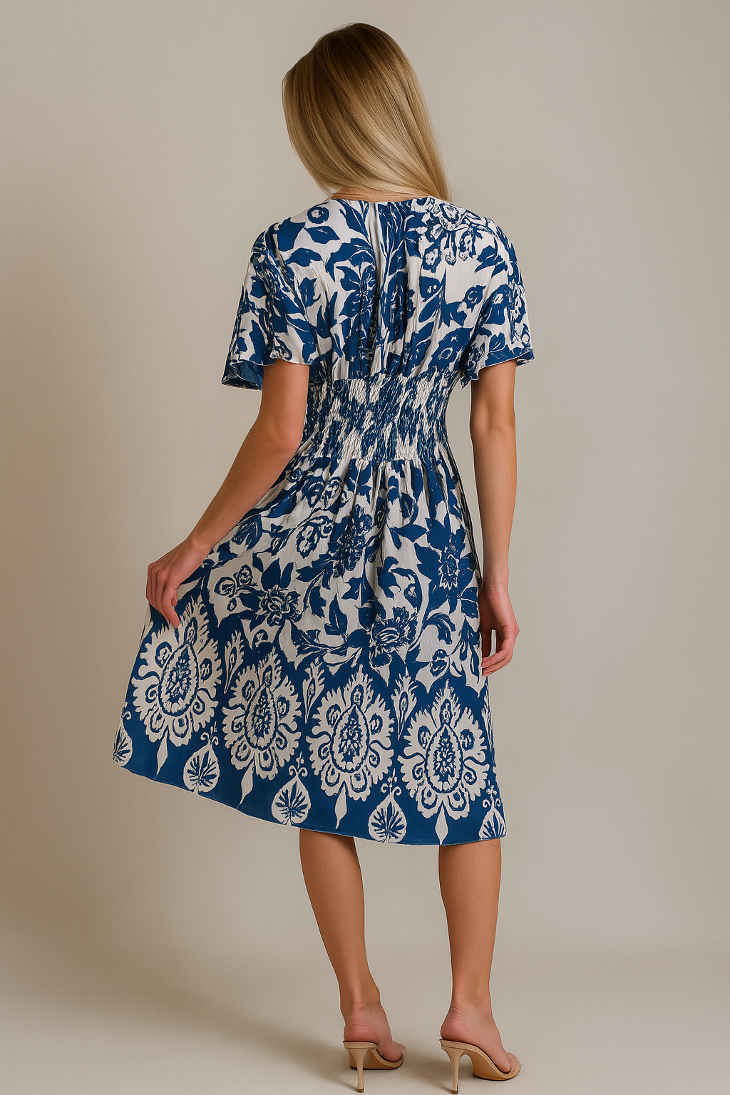 Designed with a relaxed oversized silhouette and a smocked waist to enhance your natural shape, this mini dress is a celebration of carefree style. The soft colours hue and white floral print adds a romantic charm, while the deep V-neckline and short flutter sleeves offer a flattering, feminine touch.