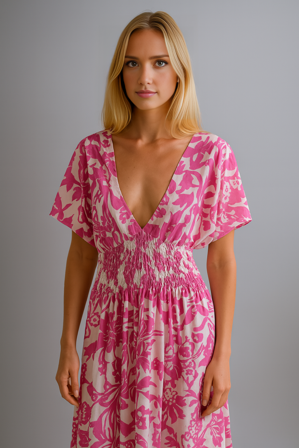 Embrace effortless elegance with our Oversized Floral V-Neck Short Sleeve Boho Style Smocked Mini Dress.