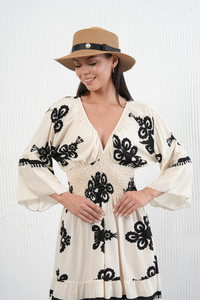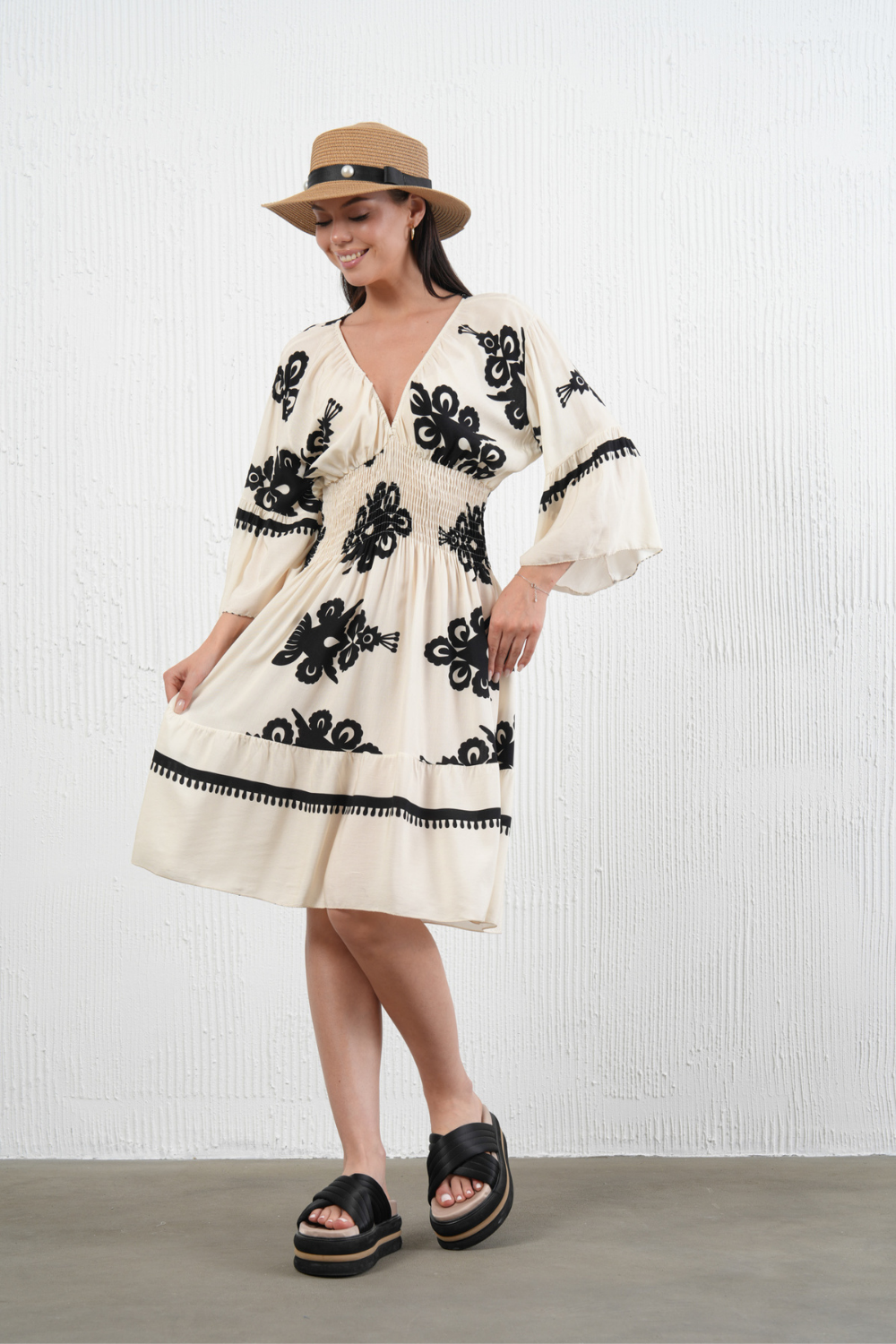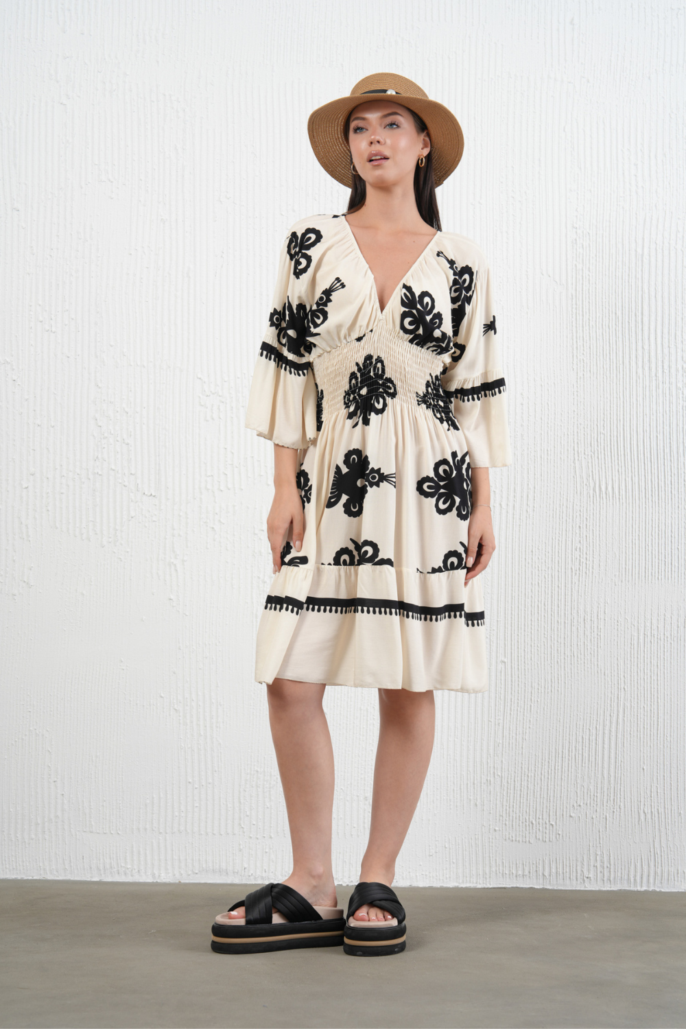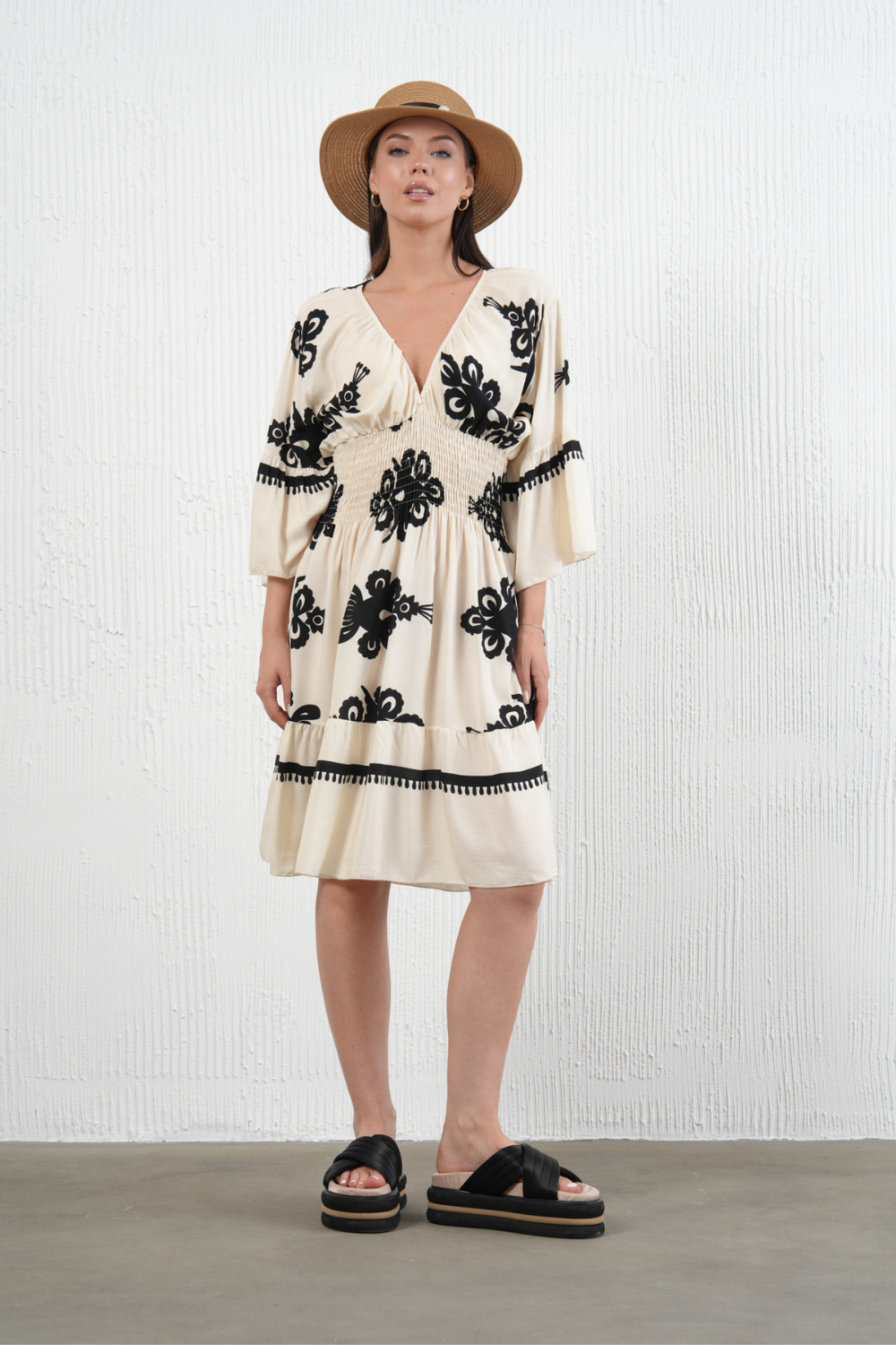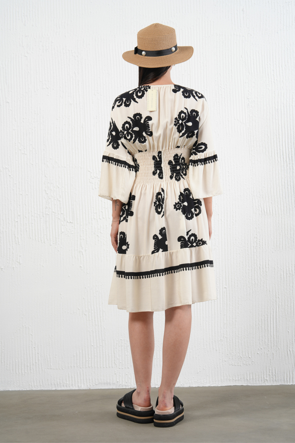 Relaxed Fit 3/4 Sleeves V Neck Printed Knee Lenght Dress in Beige and Black