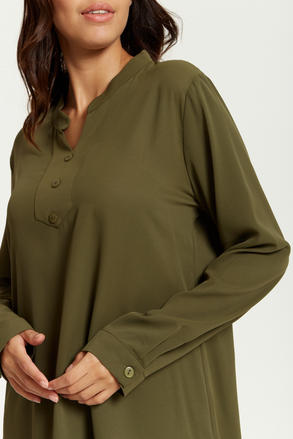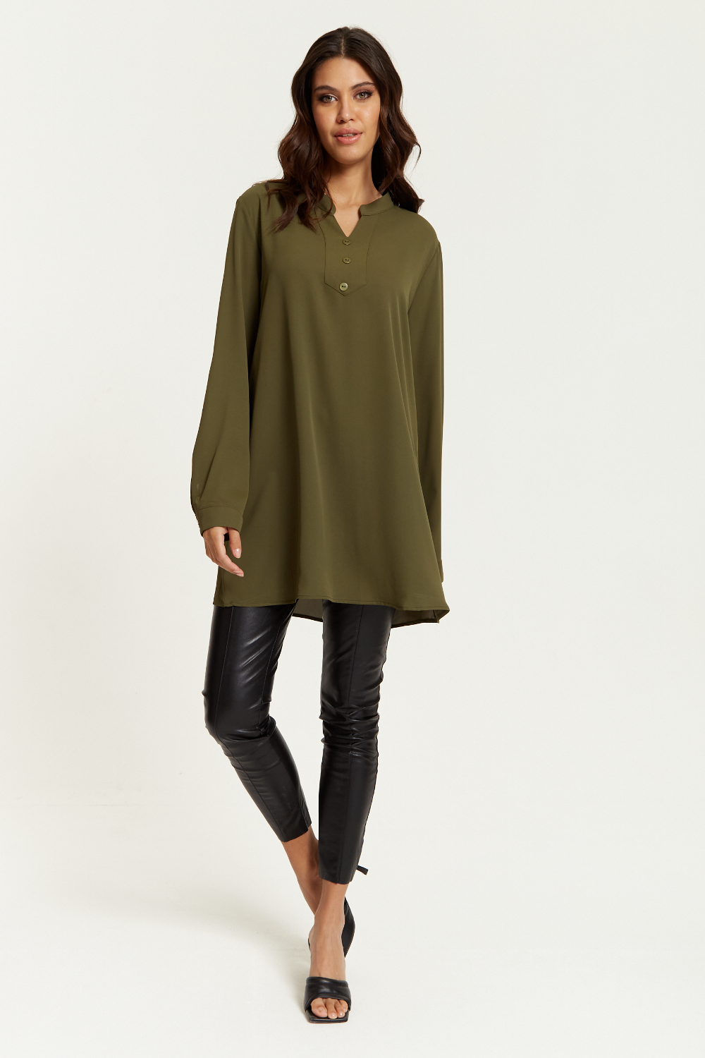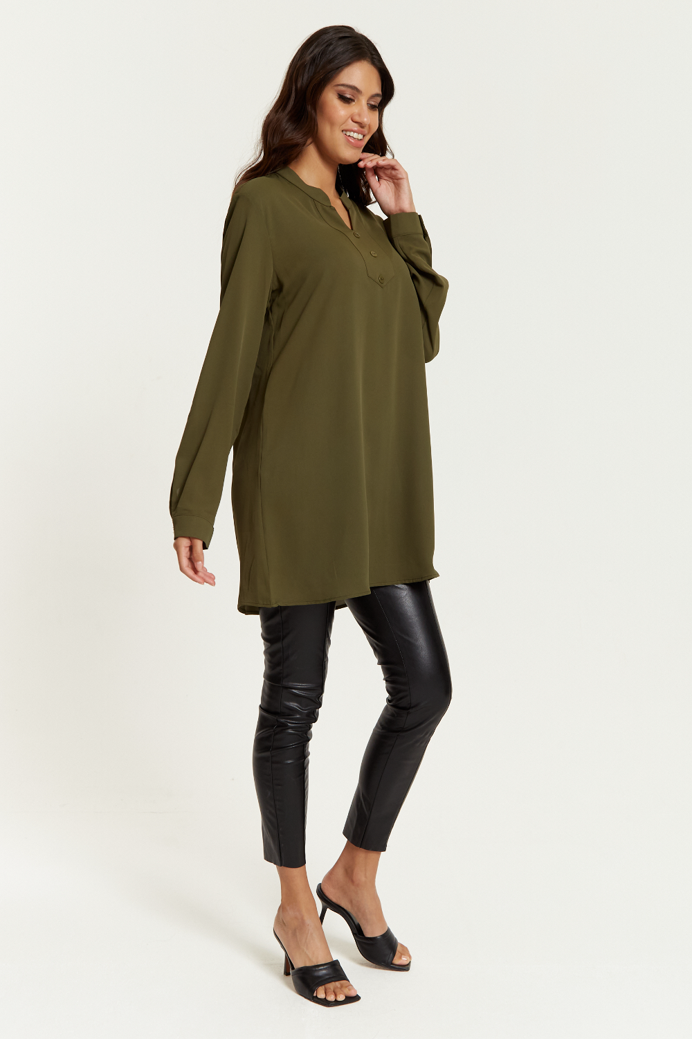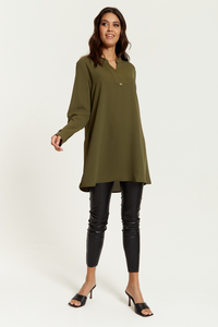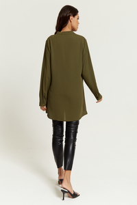 This khaki mini tunic dress is this seasons must-have material with a frill. Pair with heeled sandals and a large bag for that glam look this Autumn!