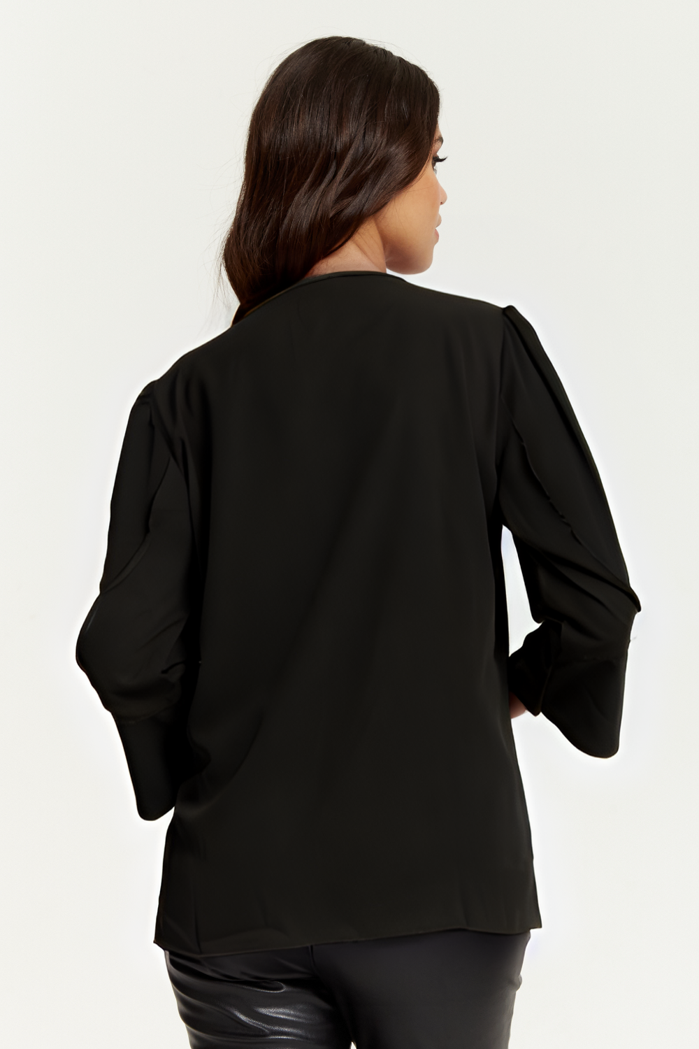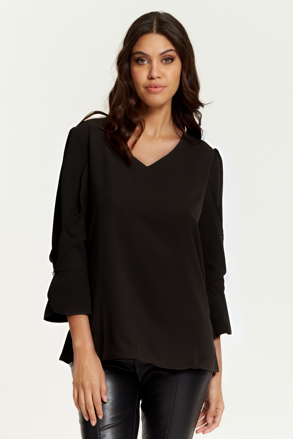 Long Sleeves Detailed Cuff Blouse with V Neck in Black