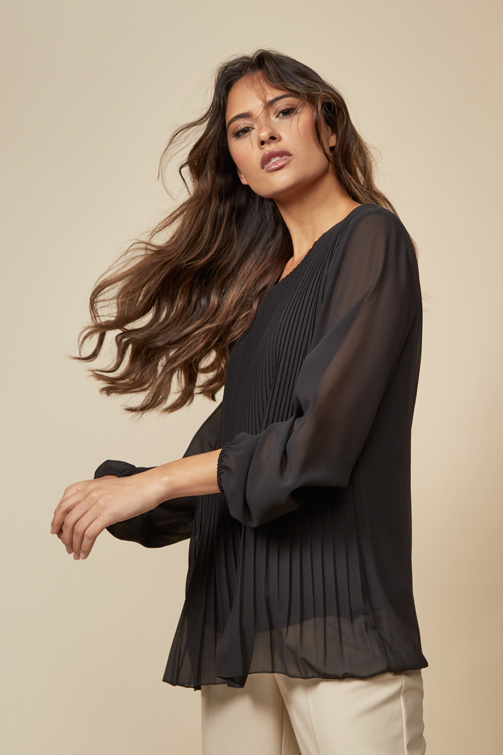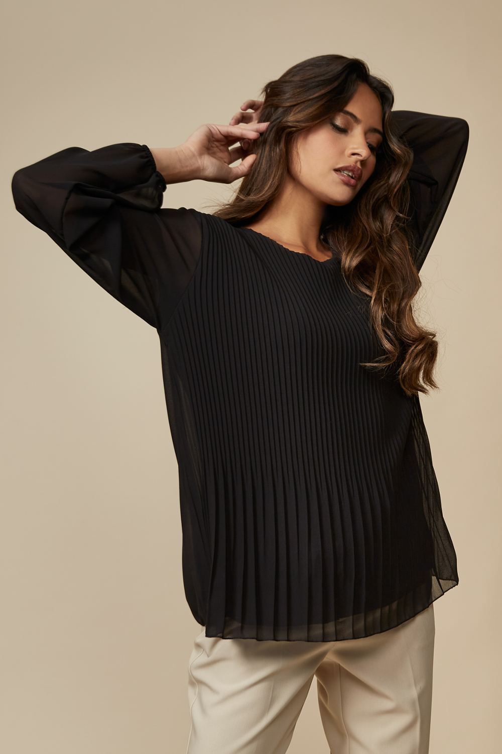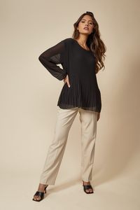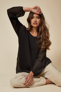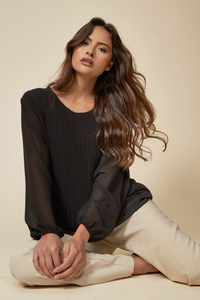 Long Sleeves Oversized Pleated Top with Tulle Details in Black