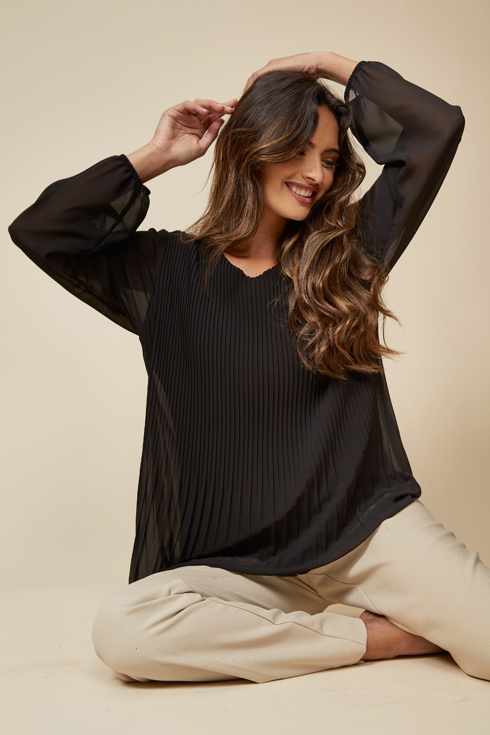 | " Long Sleeves Oversized Pleated Top with Tulle Details in Black is an elegant piece for special occasions. You can go night parties, day trips, birthday parties and any gathering!" "Perfect for Summer Spring/Summer Tops Oversized Tops Perfect Tops for Summer Weekends Summer Garden Parties Black Blouses Black Tops Bridesmaid Wedding Guest Long Sleeves Sheer Detail Pleated Fabric Oversized Fit Cosy and Comfy Relaxed and Roomy Size 18 Lightweight Fabric" "Model is 5ft 6in and wears size One size Designed for a relaxed fit Fits true to size, take your normal size" 💦CARE INSTRUCTIONS: Check the care label for instructions. ● Pre-treat stains before washing. ● Machine wash on a gentle cycle with cold water. ● Use a mild detergent suitable for delicate fabrics. ● Avoid bleach and fabric softeners. ● Air dry or use a low heat setting in the dryer. ● Iron on a low-temperature setting if needed. ● Store in a cool, dry place away from sunlight. |
