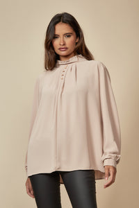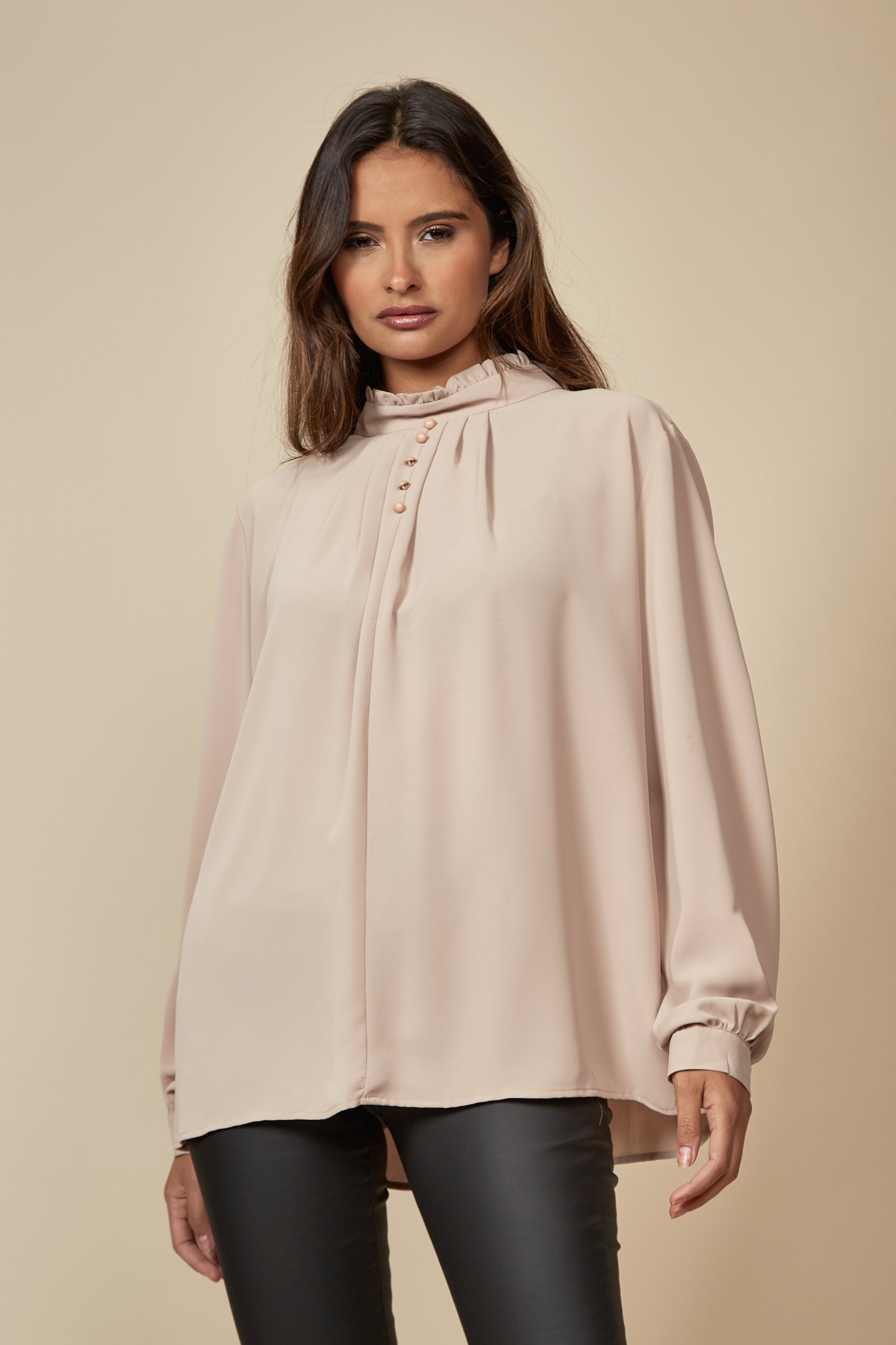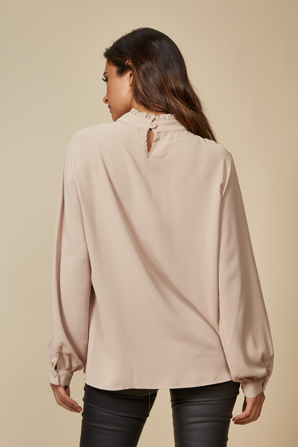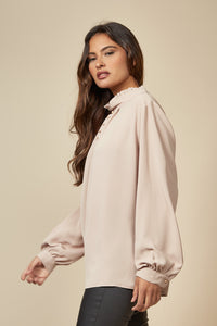 Oversized Ruffle Neck Top with Long Sleeves in Beige