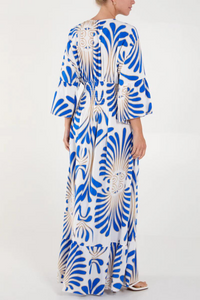 Oversized 3/4 Sleeves V Neck Feather Swirl Printed Blue Maxi Dress
