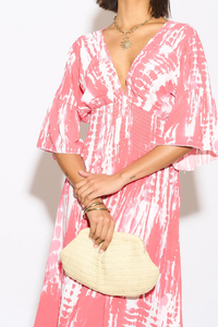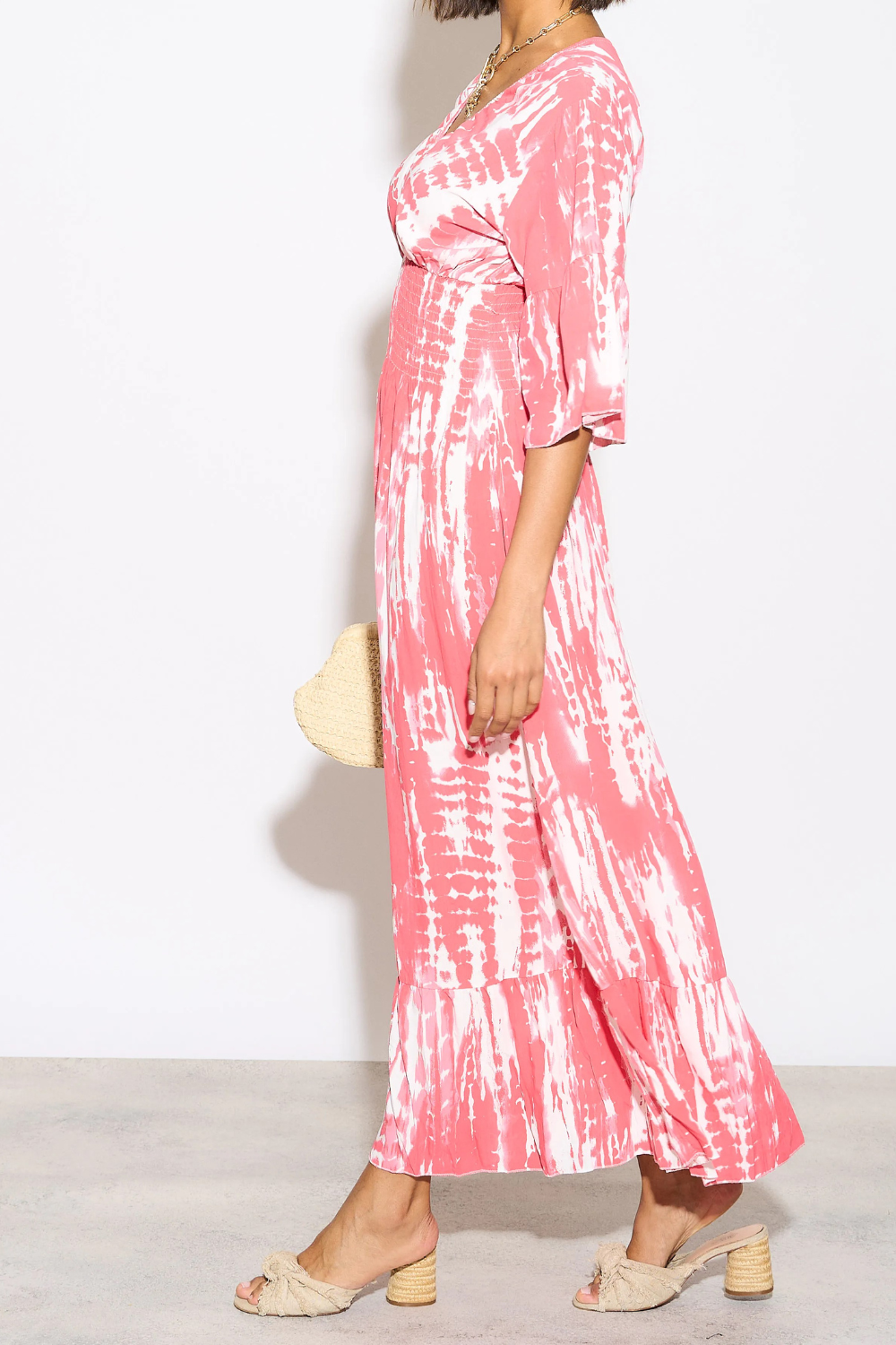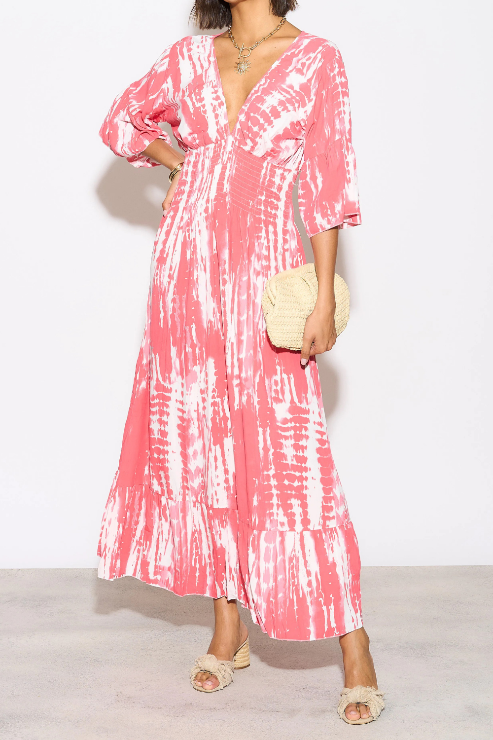 Oversized Shirred Waist Flutter Sleeve V Neck Maxi Dress with Tie Dye Print Details in White and Coral