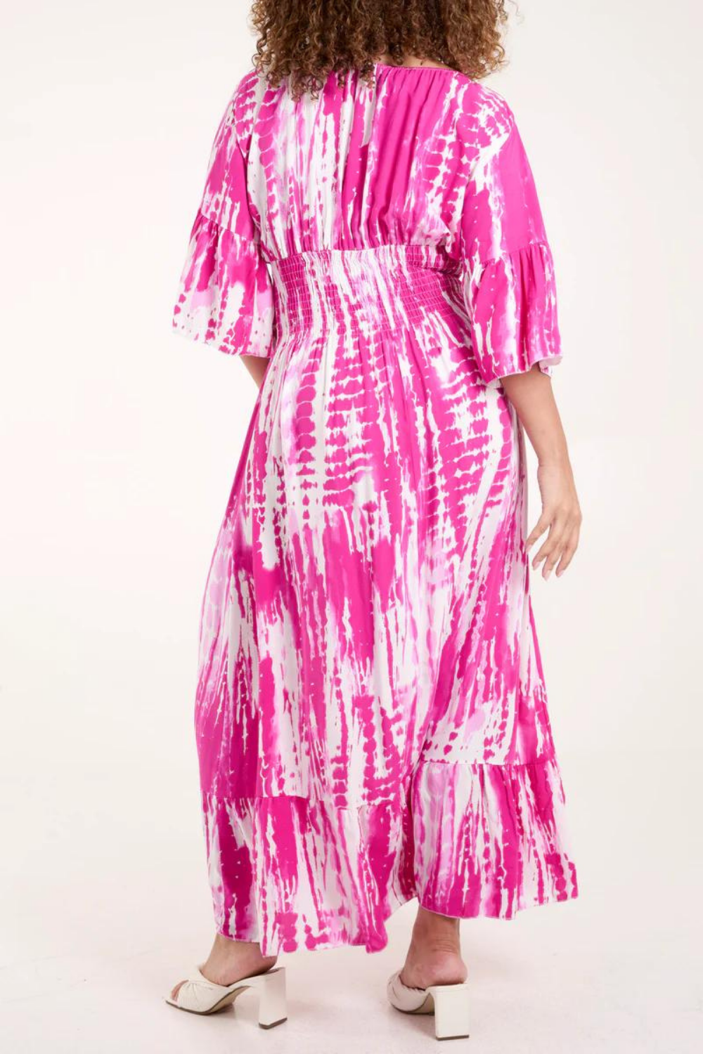 Indulge in timeless elegance with our Relaxed Fit 3/4 Sleeves Shirred Waist Printed V Neck Maxi Dress in Pink and White, crafted from luxurious viscose. The delicate pink and white print exudes femininity and sophistication, perfect for any occasion. Featuring 3/4 sleeves and a shirred waist, it flatters your figure while providing comfort and ease of movement. The V-neck adds a touch of allure to this versatile maxi dress, allowing you to effortlessly transition from day to night with style and grace.