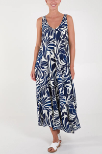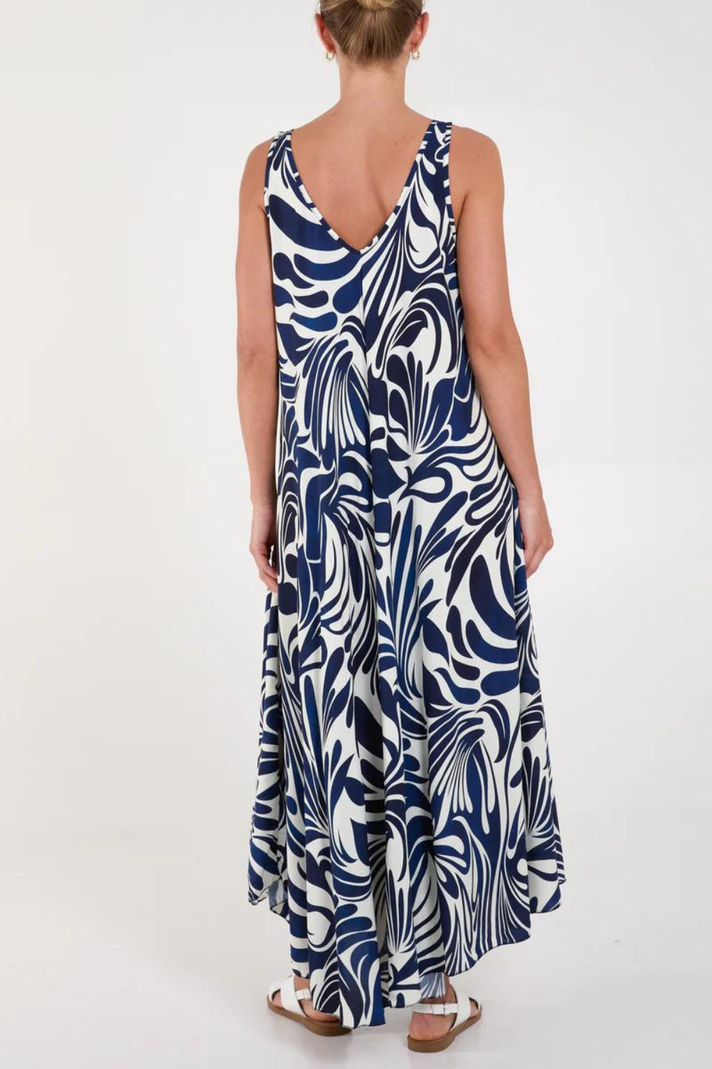 Relaxed Fit Printed Cami Dress in Royal Blue and White