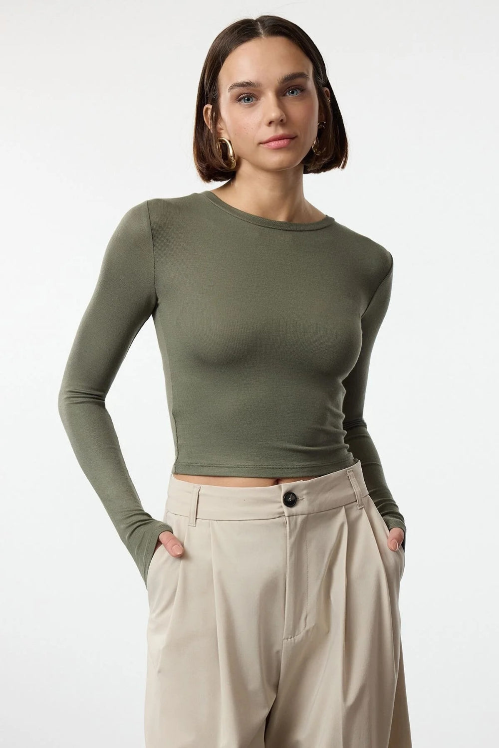 Premium Viscose Crew Neck Cropped Stretch Knit Blouse