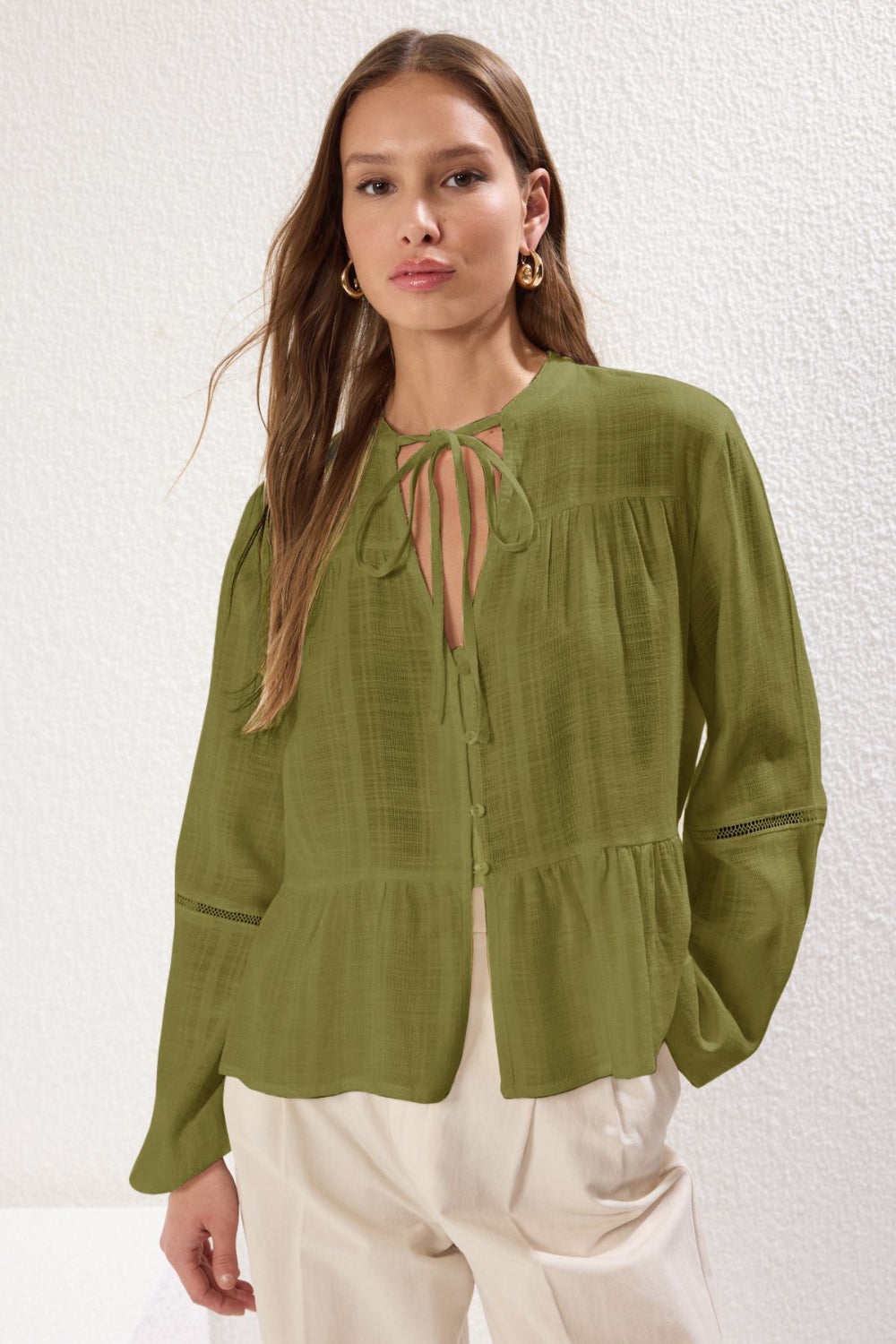 Textured Cotton Woven Blouse with Lace Detail on Sleeves – Regular Fit