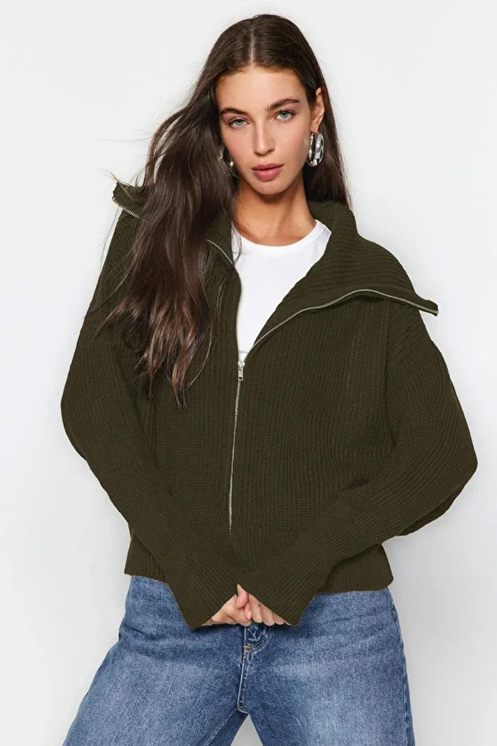 Oversized Draped Collar Zip-Up Knit Cardigan