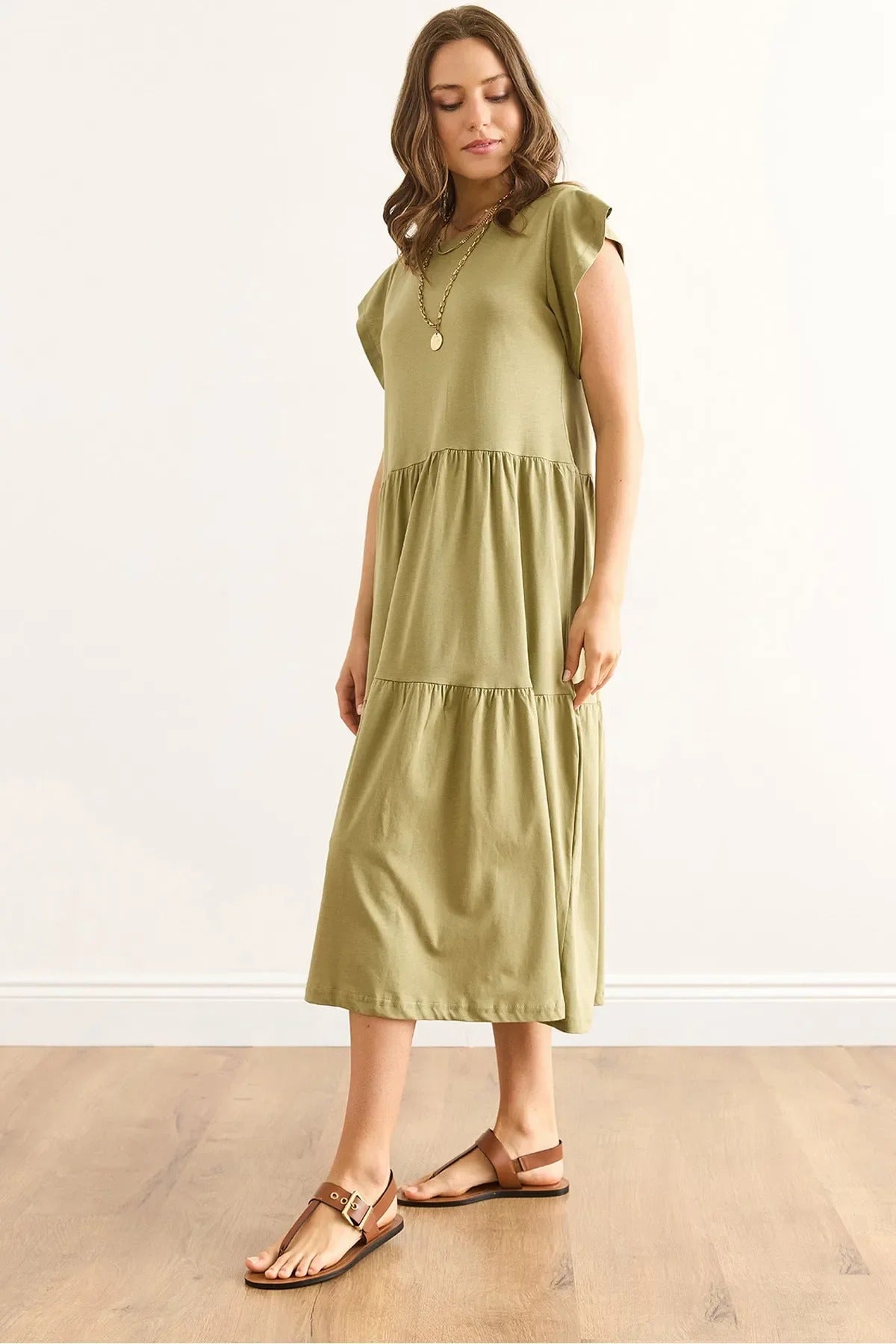 Relaxed Fit V-Neck Batwing Sleeve Midi Dress Kaftan Style in Khaki