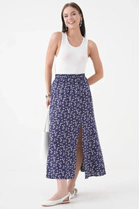 Navy A-Line Woven Skirt with Elastic Waist and Side Slit with Animal Print