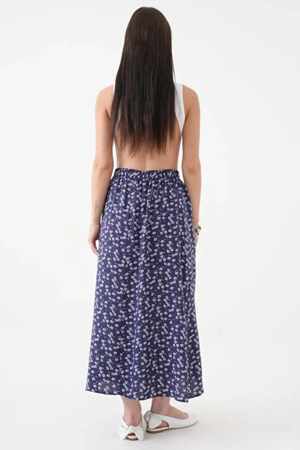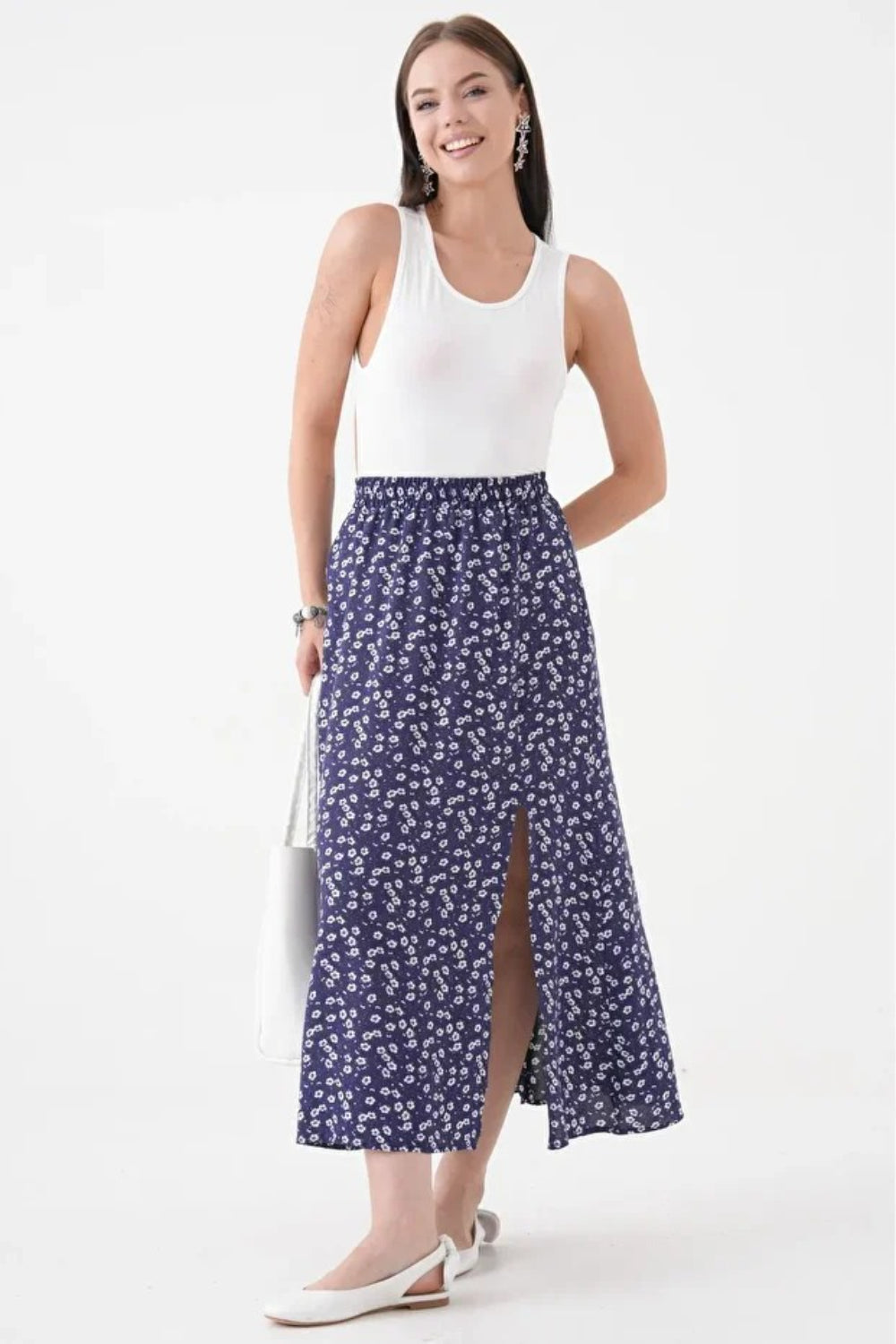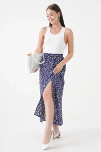 This navy A-line skirt combines timeless elegance with subtle edge. Crafted from polyester, it offers a lightweight woven texture for comfortable wear. The elastic waistband ensures a flexible, flattering fit, while the side slit reveals a striking animal print detail, adding a contemporary twist to a classic silhouette. Ideal for both professional settings and stylish outings, this skirt balances sophistication and flair effortlessly.