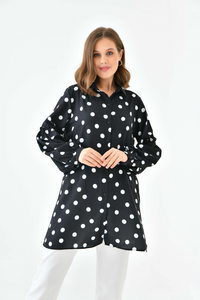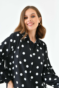 Step into this Oversized Balloon Sleeves Shirt Tunic with Polka Dot Print in Black and White and Black for a perfect office day. Pair it with high-heels for a brunch out with your friends or with boots for and off-duty look!!