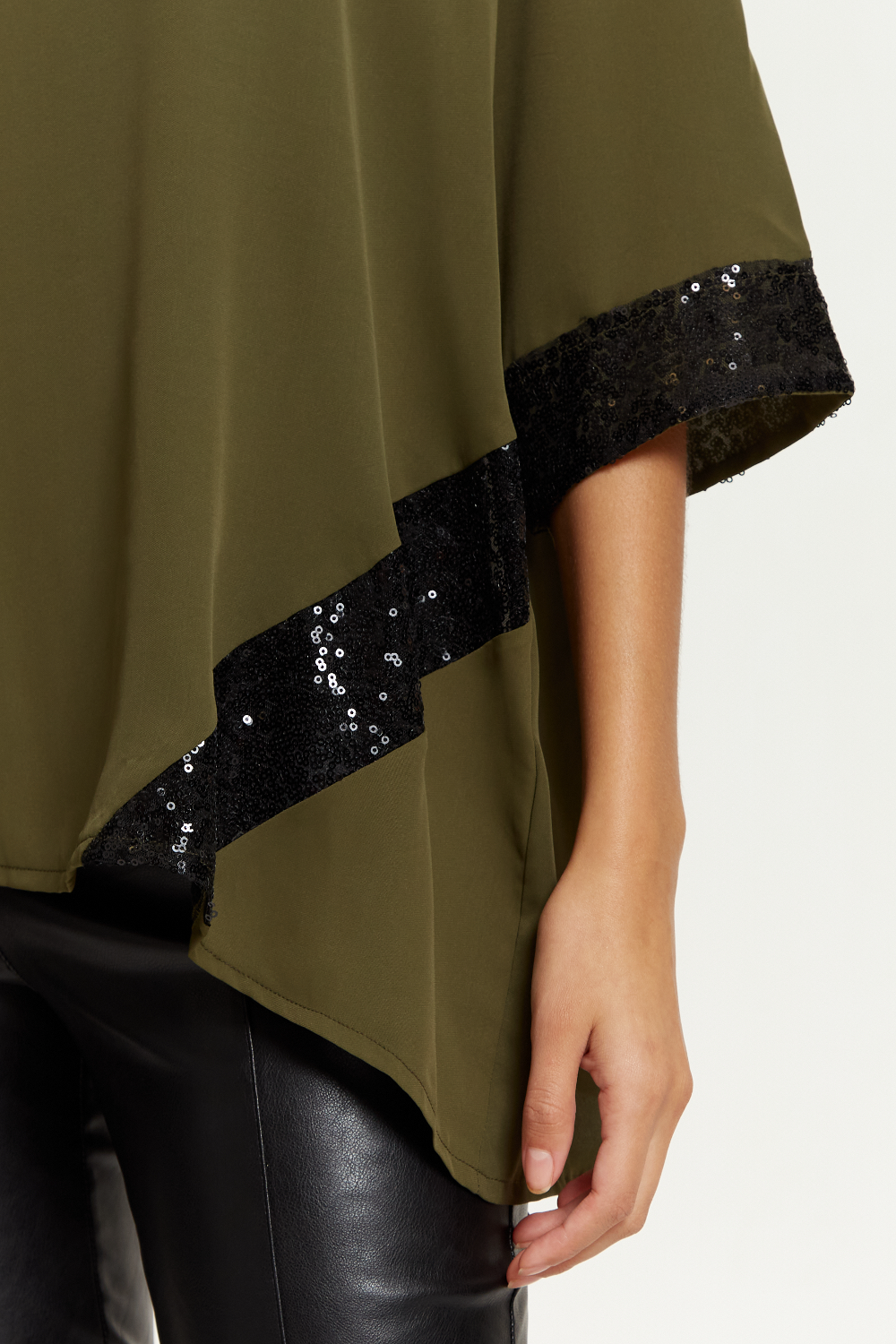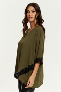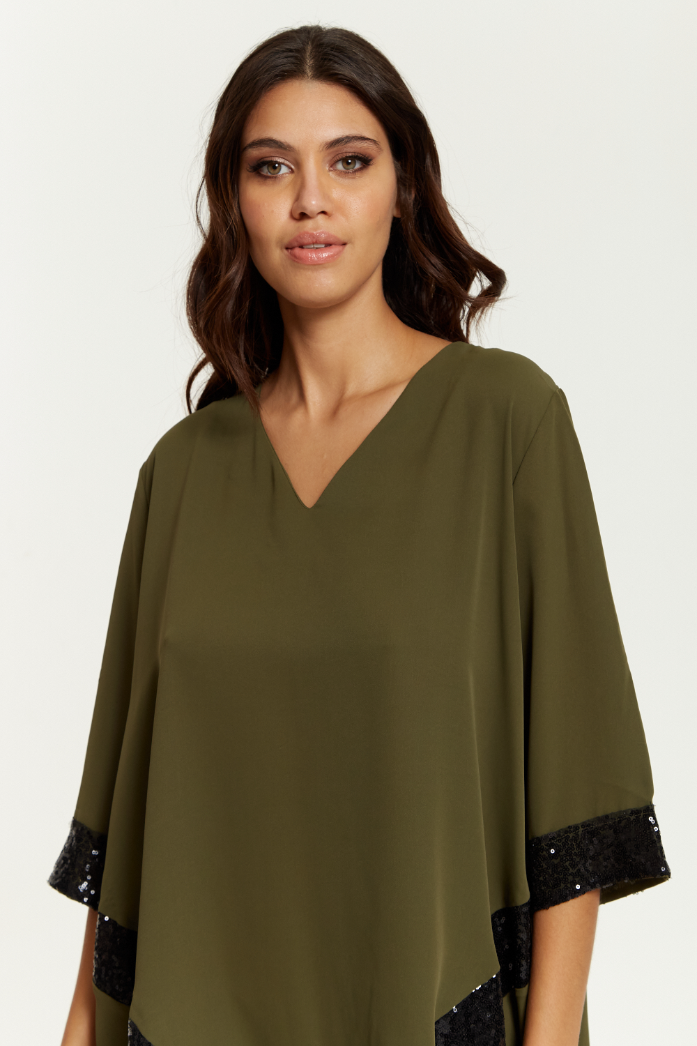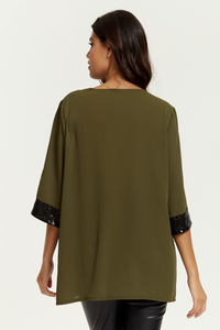 Oversized V Neck Sequin Detailed Satin Top with 3/4 Sleeves in Khaki