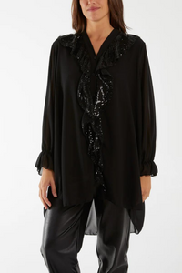 Relaxed Fit Long Sleeves Frilled Front Sequin Detail Tunic Top in Black