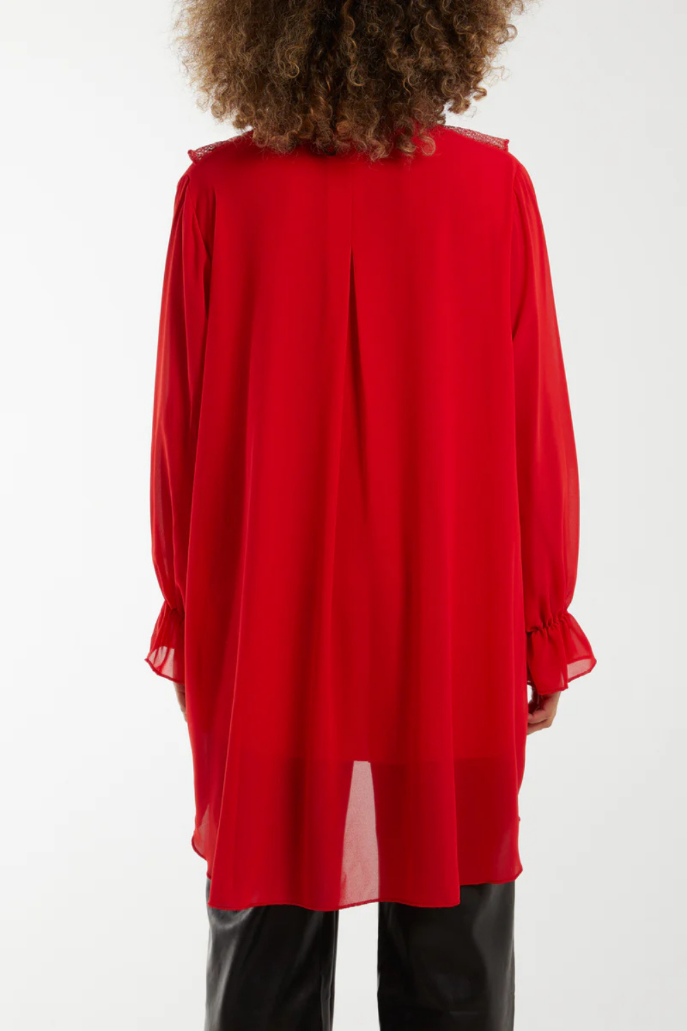Relaxed Fit Long Sleeves Frilled Front Sequin Detail Tunic Top in Red