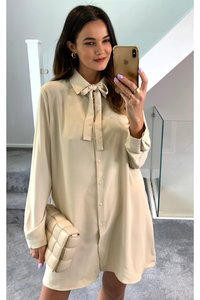 Oversized Tie Detailed Shirt Tunic with Long Sleeves in Beige