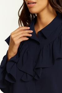 Add some classiness to your wardrobe with this Oversized Frilled Front Shirt with Detailed Cuffs . You can combine it with a matching clutch for a dressed up look!