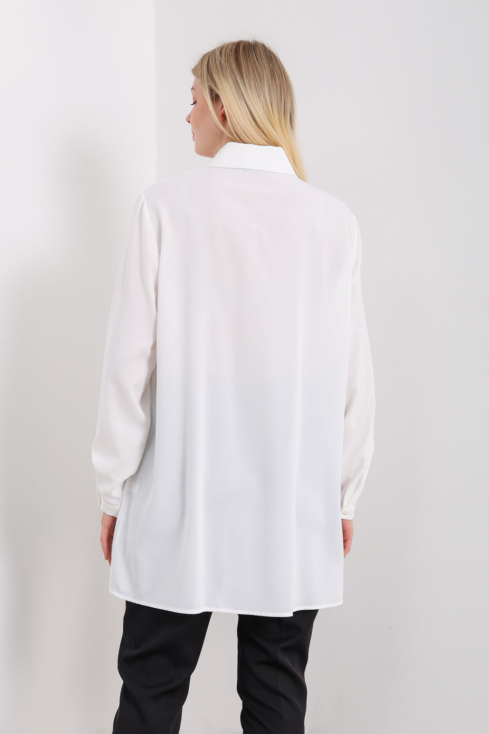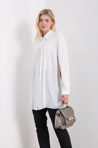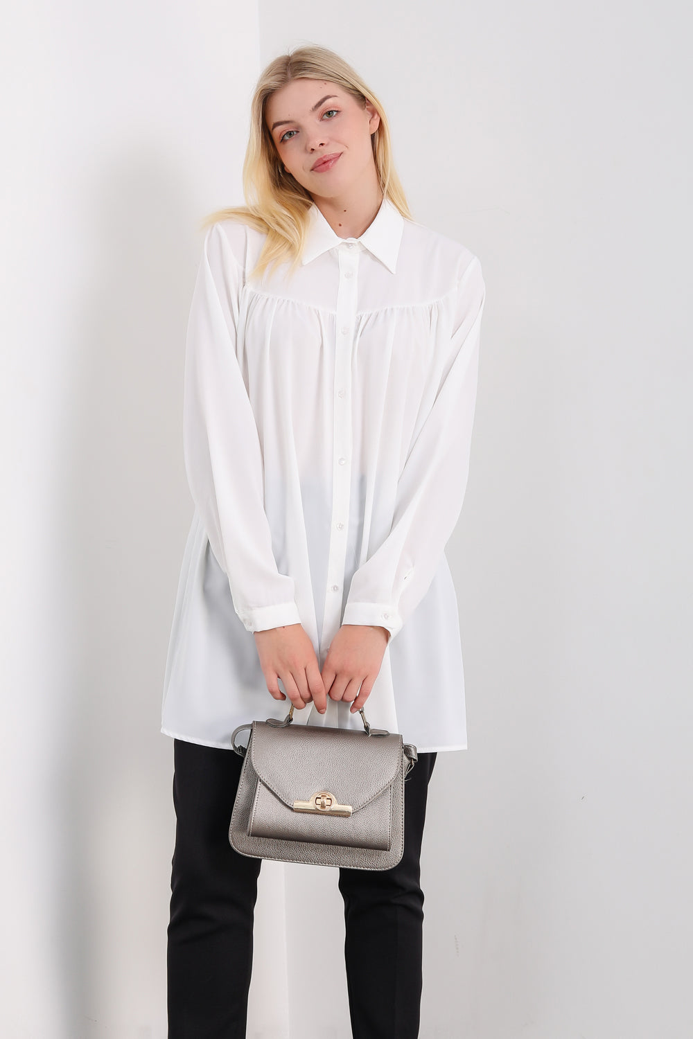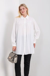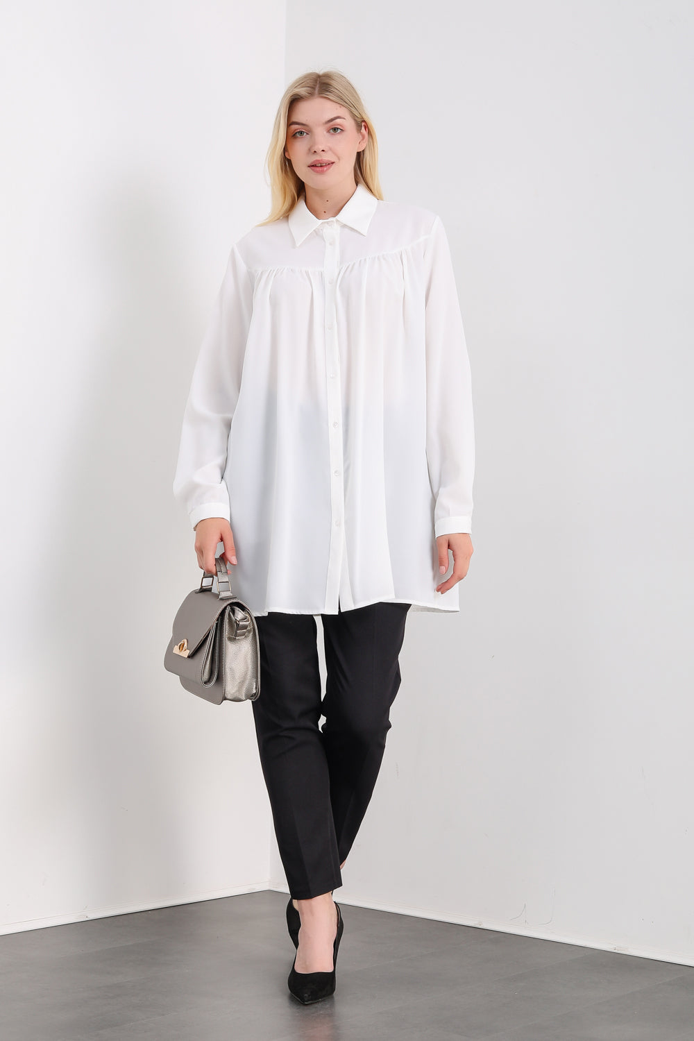 Effortlessly elevate your ensemble with this white relaxed-fit tunic, epitomizing timeless sophistication with long sleeves for added elegance. Meticulously crafted, this piece ensures both comfort and style. The relaxed silhouette offers modern allure, suitable for versatile styling. Whether for casual outings or formal events, this tunic effortlessly enhances your ensemble, exuding grace and confidence with every wear.