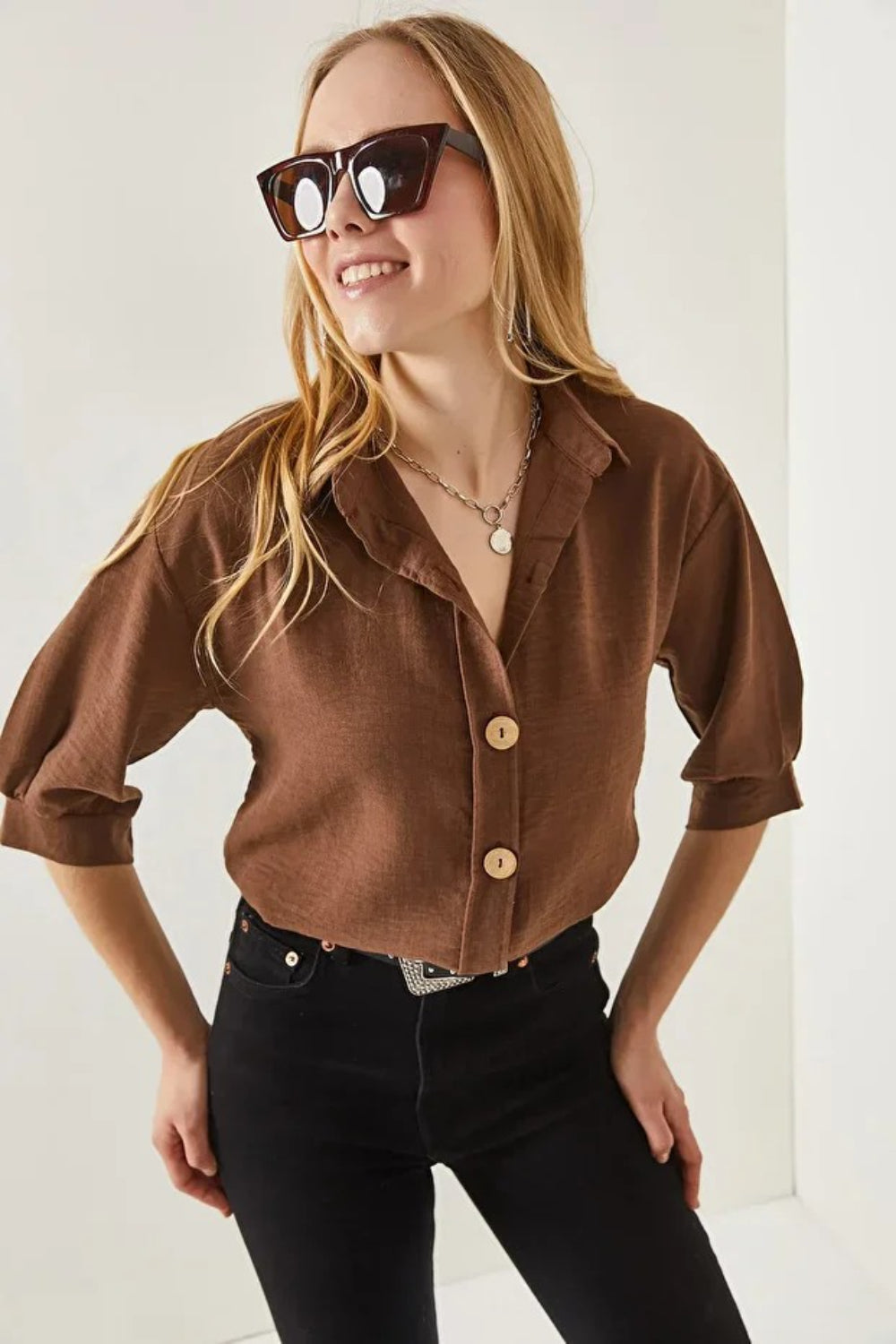 Linen Shirt with Wooden Buttons and Three-Quarter Sleeves